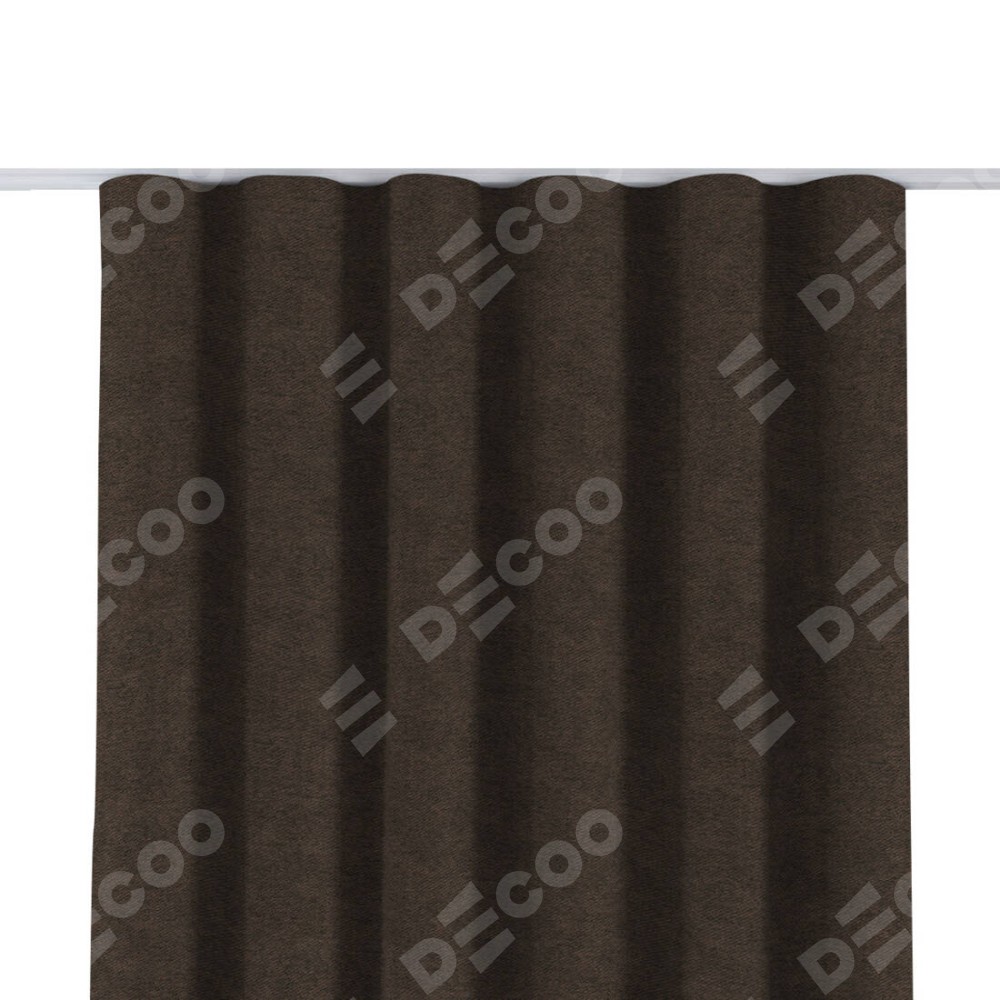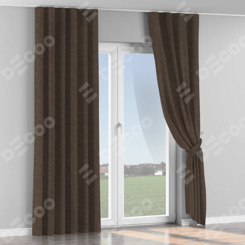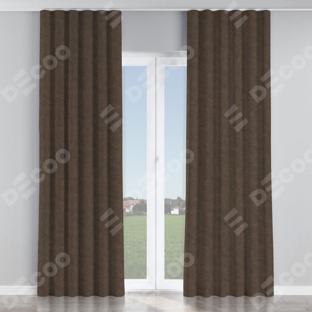 Комплект прямых штор, от производителя «Cortin», пошиты из ткани твид блэкаут тёмно-коричневый, артикул ткани 90933. С изнаночной стороны в верхней части штор пристрачивается шторная лента с декоративными складками «Волна». Для создания элегантных складок прямые шторы шьются по стандарту с коэффициентом 1:2 (на 100 см. ширины проёма 200 см. ширины ткани).