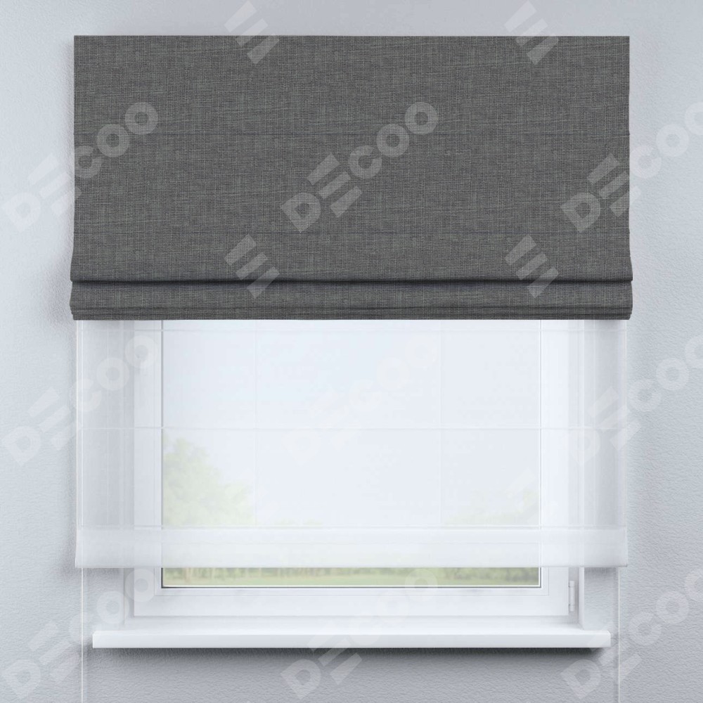 Двойная римская штора «День-ночь» от производителя Cortin предназначена для использования в проёмах. Эта штора уникальна тем, что состоит из двух полотен. На лицевой стороне находится лён тёмно-серый (артикул: 7441), обеспечивающий мягкое затемнение. В комплект также входит вторая ткань — легкий белый тюль (артикул: V-01), который добавляет изящества и легкости оформлению окна. Кроме того, доступны и другие разновидности ткани тюль, выбор которых доступен по ссылке .