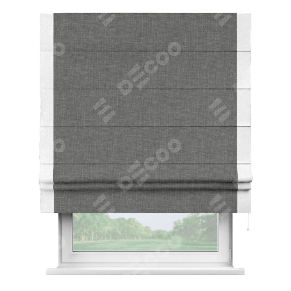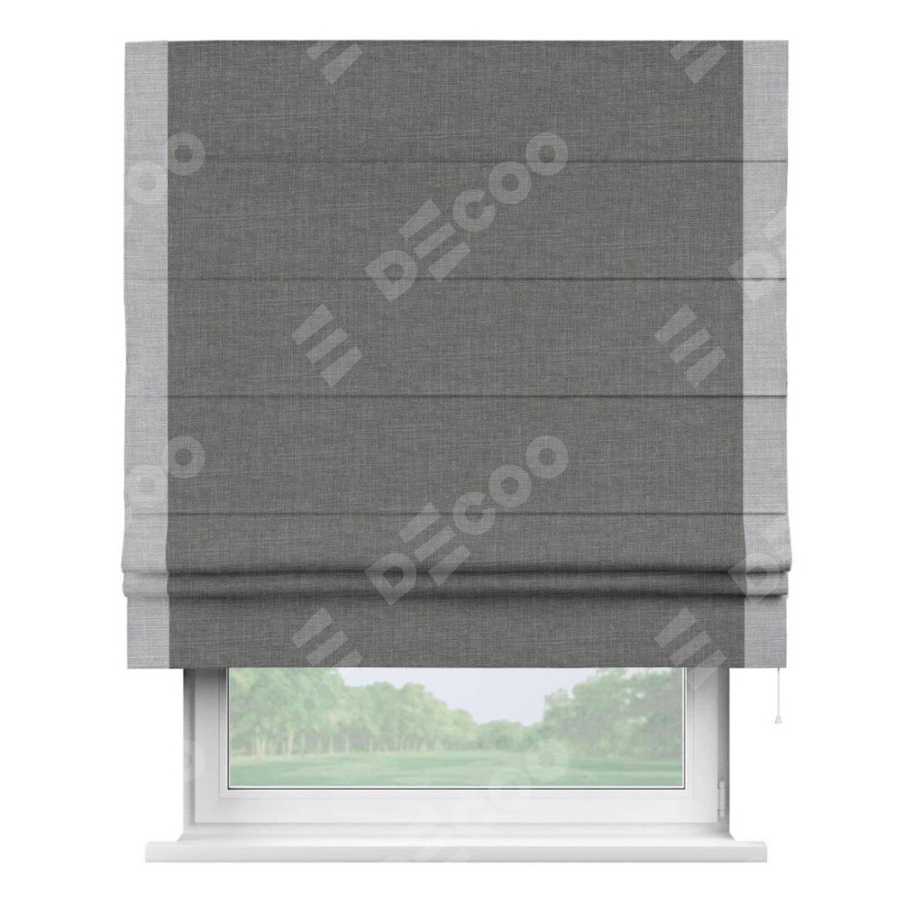 Римская штора производителя «Cortin», используется для проёма, пошита из ткани лён тёмно-серый, артикул 7441. Отделка шторы кантом «Стрим Дуо», ткань для канта используется из льна разной расцветки на выбор. Имеет универсальный механизм и подходит для монтажа: на потолок, на стену и в нишу.