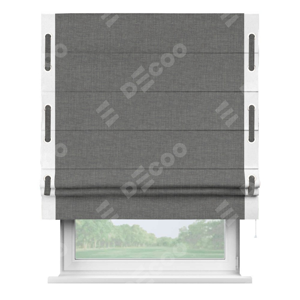 Римская штора производителя «Cortin», используется для проёма, пошита из ткани лён тёмно-серый, артикул 7441. Отделка шторы кантом «Стрим Дуо» на кантах расположены люверсы с пояском, ткань для канта используется из льна разной расцветки на выбор. Ткань для пояска обычно используется из основной ткани шторы, а так же можно сделать из любой расцветки по желанию. Имеет универсальный механизм и подходит для монтажа: на потолок, на стену и в нишу.