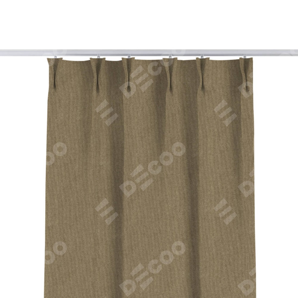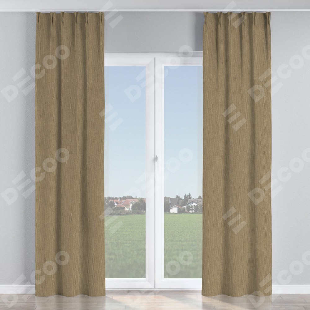 Комплект прямых штор, от производителя «Cortin», пошиты из ткани лён димаут тёмно-бежевый, артикул ткани 16261. С изнаночной стороны в верхней части штор пристрачивается шторная лента с декоративными складками «Кустик». Для создания элегантных складок прямые шторы шьются по стандарту с коэффициентом 1:2 (на 100 см. ширины проёма 200 см. ширины ткани).