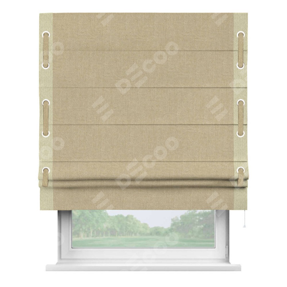 Римская штора «Кортин» для проема, лён димаут песочный с кантом Стрим Дуо (люверсы с пояском)