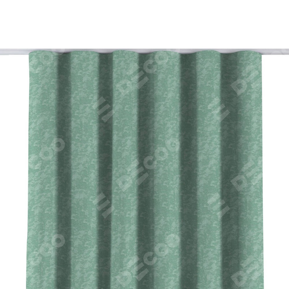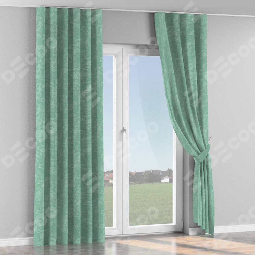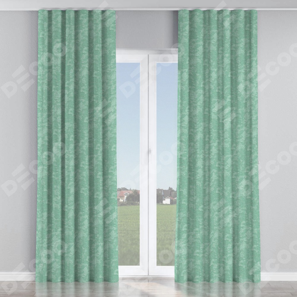 Комплект прямых штор, от производителя «Cortin», пошиты из ткани софт мрамор светло-зелёный, артикул ткани 93579. С изнаночной стороны в верхней части штор пристрачивается шторная лента с декоративными складками «Волна». Для создания элегантных складок прямые шторы шьются по стандарту с коэффициентом 1:2 (на 100 см. ширины проёма 200 см. ширины ткани).