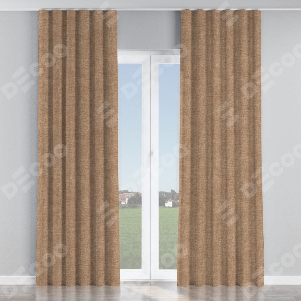 Комплект прямых штор, от производителя «Cortin», пошиты из ткани рогожка димаут светло-коричневый, артикул ткани 91017. С изнаночной стороны в верхней части штор пристрачивается шторная лента с декоративными складками «Волна». Для создания элегантных складок прямые шторы шьются по стандарту с коэффициентом 1:2 (на 100 см. ширины проёма 200 см. ширины ткани).