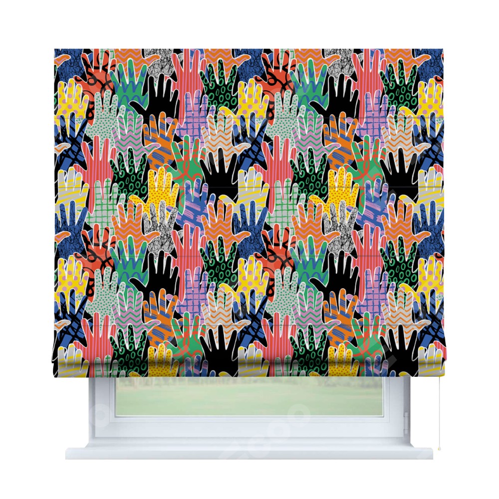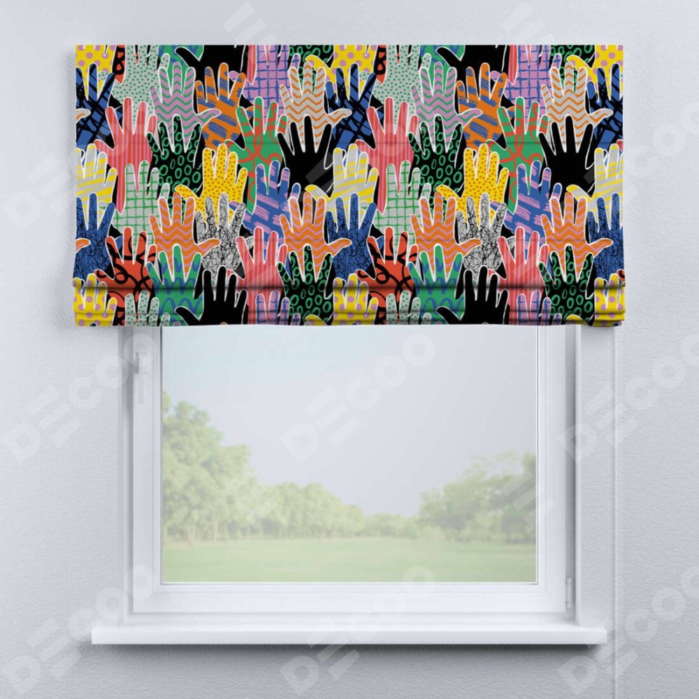 Классическая римская штора производителя «Cortin», пошита из ткани блэкаут с нанесением сублимационной печати «Коллаж поп-арт». Имеет универсальный механизм и подходит для монтажа: на потолок, на стену и в нишу.