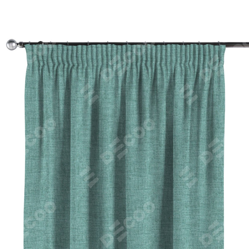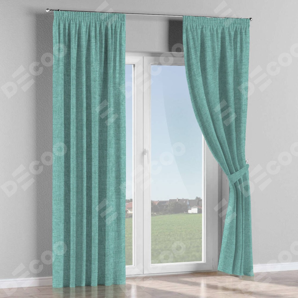 Комплект прямых штор, от производителя «Cortin», пошиты из ткани рогожка димаут аквамариновый крайола, артикул ткани 91023. С изнаночной стороны в верхней части штор пристрачивается шторная лента с декоративными складками «Карандаш». Для создания элегантных складок прямые шторы шьются по стандарту с коэффициентом 1:2 (на 100 см. ширины проёма 200 см. ширины ткани).