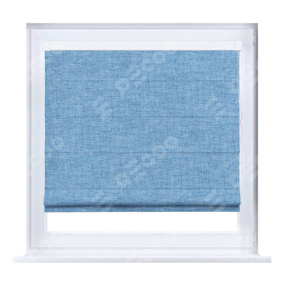 Римская штора производителя «Cortin», устанавливается на створку окна, пошита из ткани рогожка димаут голубой, артикул 91025. Штора шьётся по индивидуальным размерам, для данного типа римской шторы возможная ширина от 35 до 150 см., высота до 250 см.