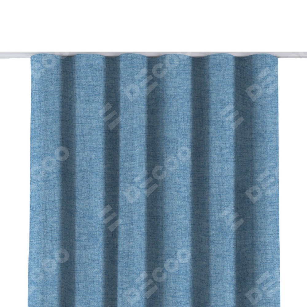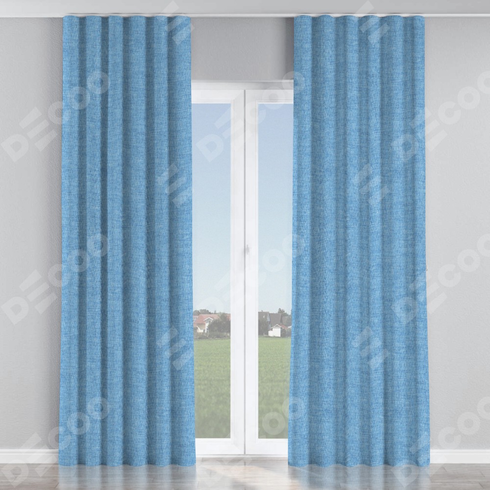 Комплект прямых штор, от производителя «Cortin», пошиты из ткани рогожка димаут голубой, артикул ткани 91025. С изнаночной стороны в верхней части штор пристрачивается шторная лента с декоративными складками «Волна». Для создания элегантных складок прямые шторы шьются по стандарту с коэффициентом 1:2 (на 100 см. ширины проёма 200 см. ширины ткани).