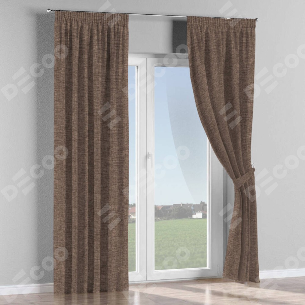 Комплект прямых штор, от производителя «Cortin», пошиты из ткани рогожка димаут коричневый, артикул ткани 91018. С изнаночной стороны в верхней части штор пристрачивается шторная лента с декоративными складками «Карандаш». Для создания элегантных складок прямые шторы шьются по стандарту с коэффициентом 1:2 (на 100 см. ширины проёма 200 см. ширины ткани).