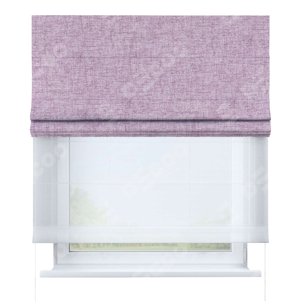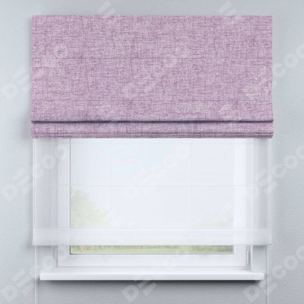 Двойная римская штора «День-ночь» от производителя Cortin предназначена для использования в проёмах. Эта штора уникальна тем, что состоит из двух полотен. На лицевой стороне находится рогожка димаут розовый (артикул: 91031), обеспечивающий эффективное затемнение. В комплект также входит вторая ткань — легкий белый тюль (артикул: V-01), который добавляет изящества и легкости оформлению окна. Кроме того, доступны и другие разновидности ткани тюль, выбор которых доступен по  ссылке .