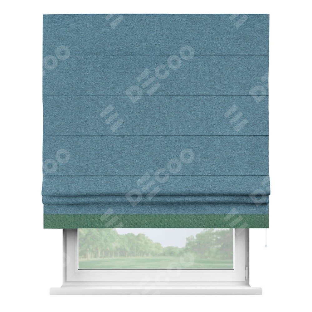 Римская штора пошита из ткани твид блэкаут светло-синий, артикул: 90935, с отделкой кантом «Джестер» выделяется своей уникальной особенностью — кантом, расположенным только снизу шторы. Этот дизайн добавляет оригинальности и игривости оконному оформлению, делая акцент на нижней части шторы и создавая интересный визуальный эффект. Отделка кантом на нижнем крае не только служит эстетической функции, но и способствует увеличению прочности и износостойкости ткани в этом месте.