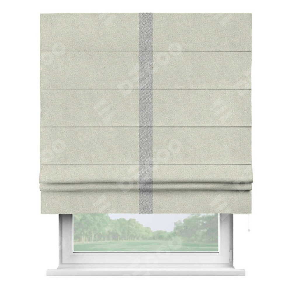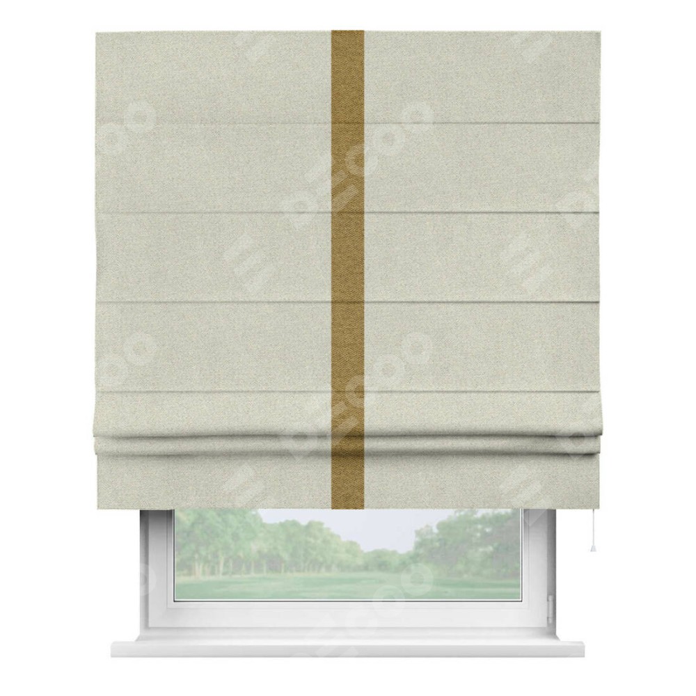 Римская штора пошита из ткани твид блэкаут шампань, артикул: 90929, с отделкой кантом «Хайвэй» представляет собой уникальное и смелое дизайнерское решение, где кант расположен вертикально посередине шторы. Этот дизайн не только выделяет штору среди других вариантов оформления окон, но и создает интересный визуальный акцент, привлекая внимание к центру окна и разделяя штору на визуальные зоны. Такой нестандартный подход добавляет динамичности интерьеру и может быть использован для подчеркивания особенностей оформления помещения.