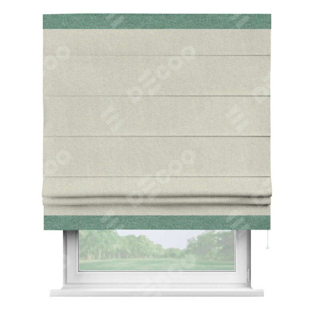 Римская штора пошита из ткани твид блэкаут шампань, артикул: 90929, с отделкой кантом «Горизонт» предлагает уникальное дизайнерское решение, при котором кант располагается только вверху и снизу шторы. Такое решение делает акцент на горизонтальных линиях, визуально расширяя пространство и придавая окну более строгий и организованный вид. Отделка кантом в этих ключевых местах не только украшает штору, но и способствует её долговечности, защищая наиболее уязвимые к износу края.