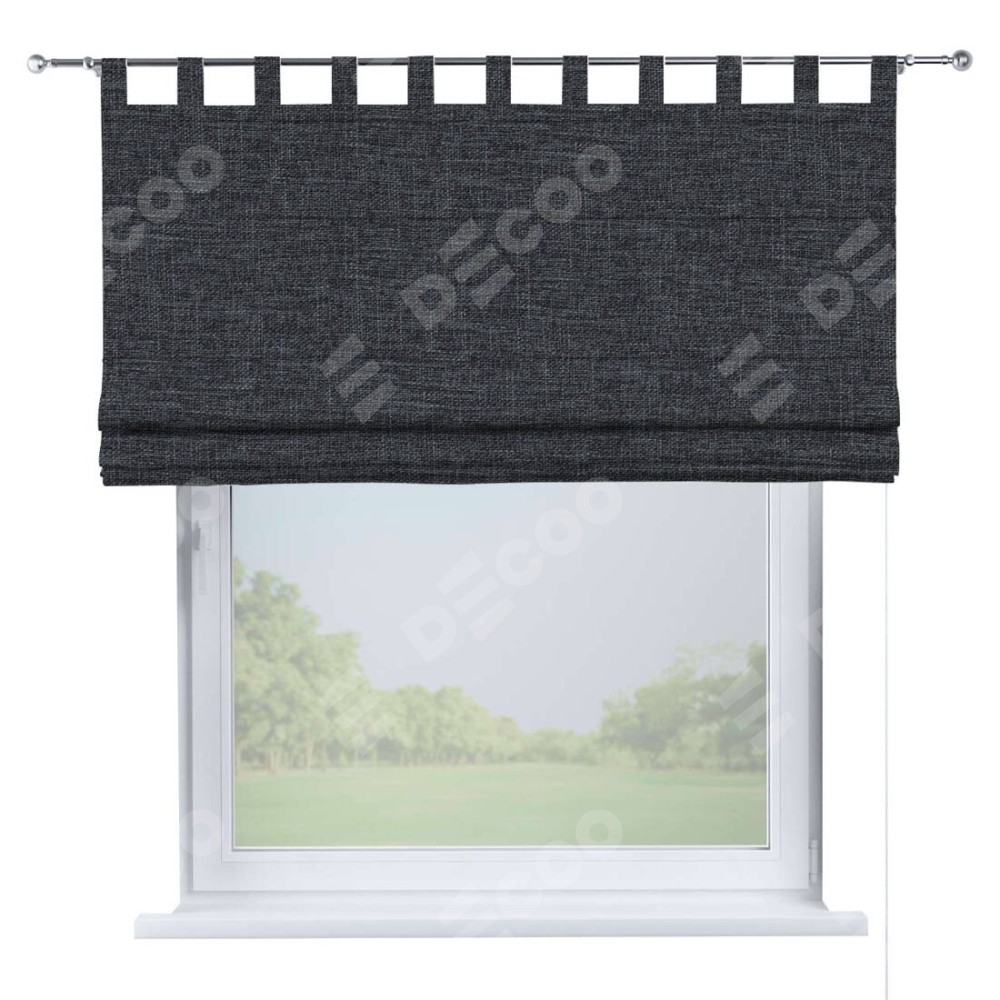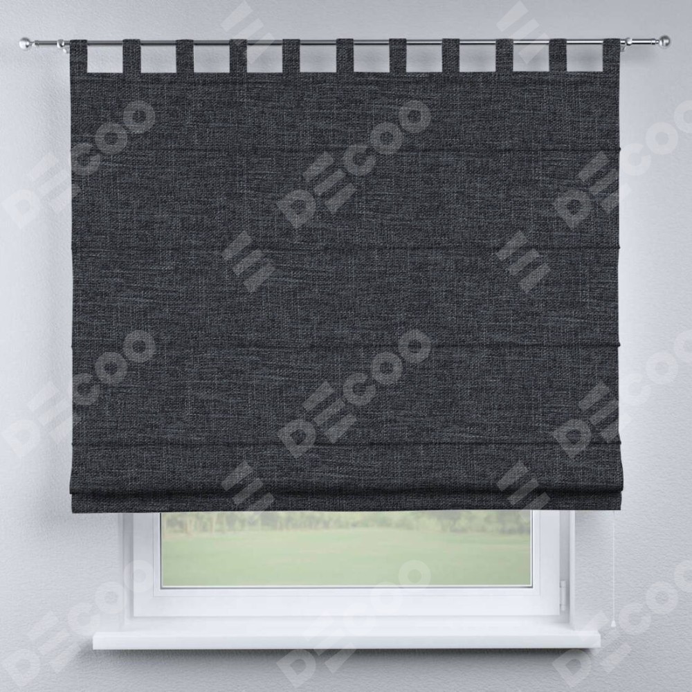 Римская штора производителя «Cortin», используется для проёма, пошита из ткани рогожка димаут графит, артикул ткани 90950. Данная модель пошита на петлях, комплектуется на выбор круглым карнизом и подходит для монтажа на стену. Римская штора на петлях имеет простую систему регулировки высоты, отличительным преимуществом данной модели является простой способ монтажа. Достаточно повесить ее на трубу и штора готова!