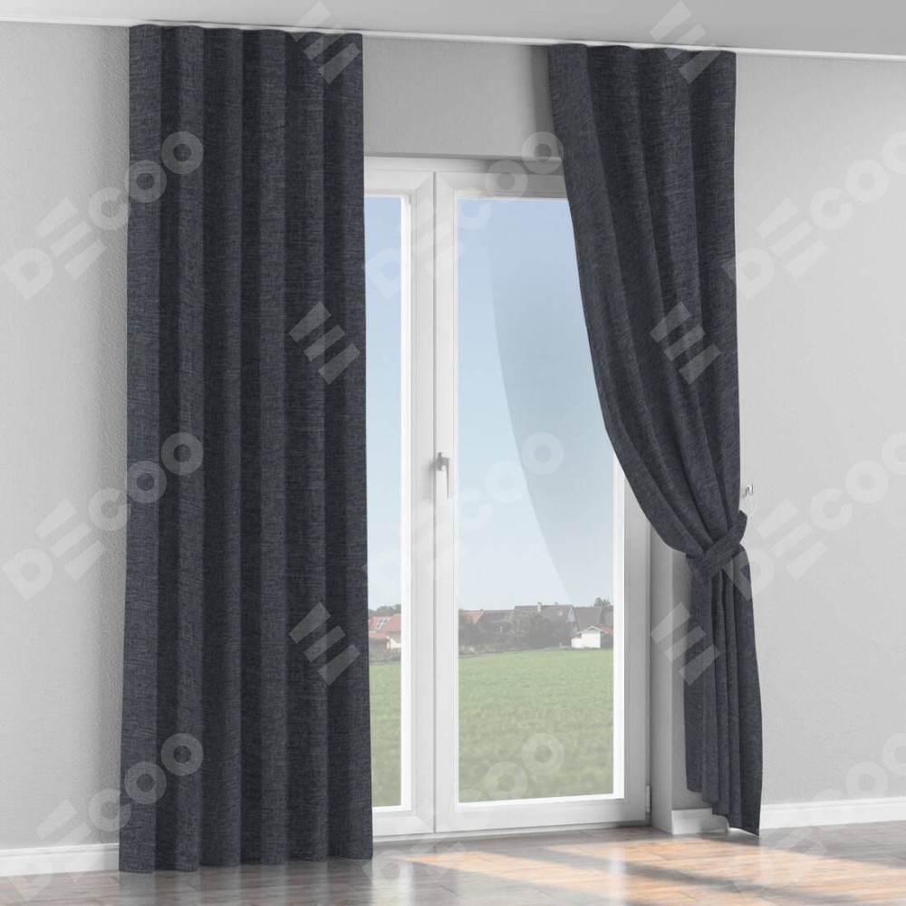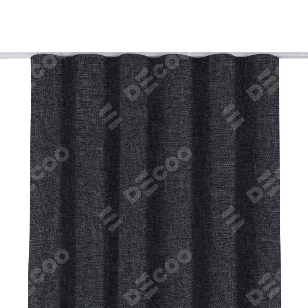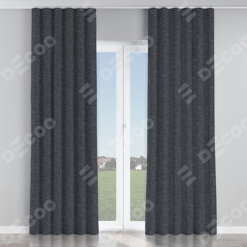 Комплект прямых штор, от производителя «Cortin», пошиты из ткани рогожка димаут графит, артикул ткани 90950. С изнаночной стороны в верхней части штор пристрачивается шторная лента с декоративными складками «Волна». Для создания элегантных складок прямые шторы шьются по стандарту с коэффициентом 1:2 (на 100 см. ширины проёма 200 см. ширины ткани).
