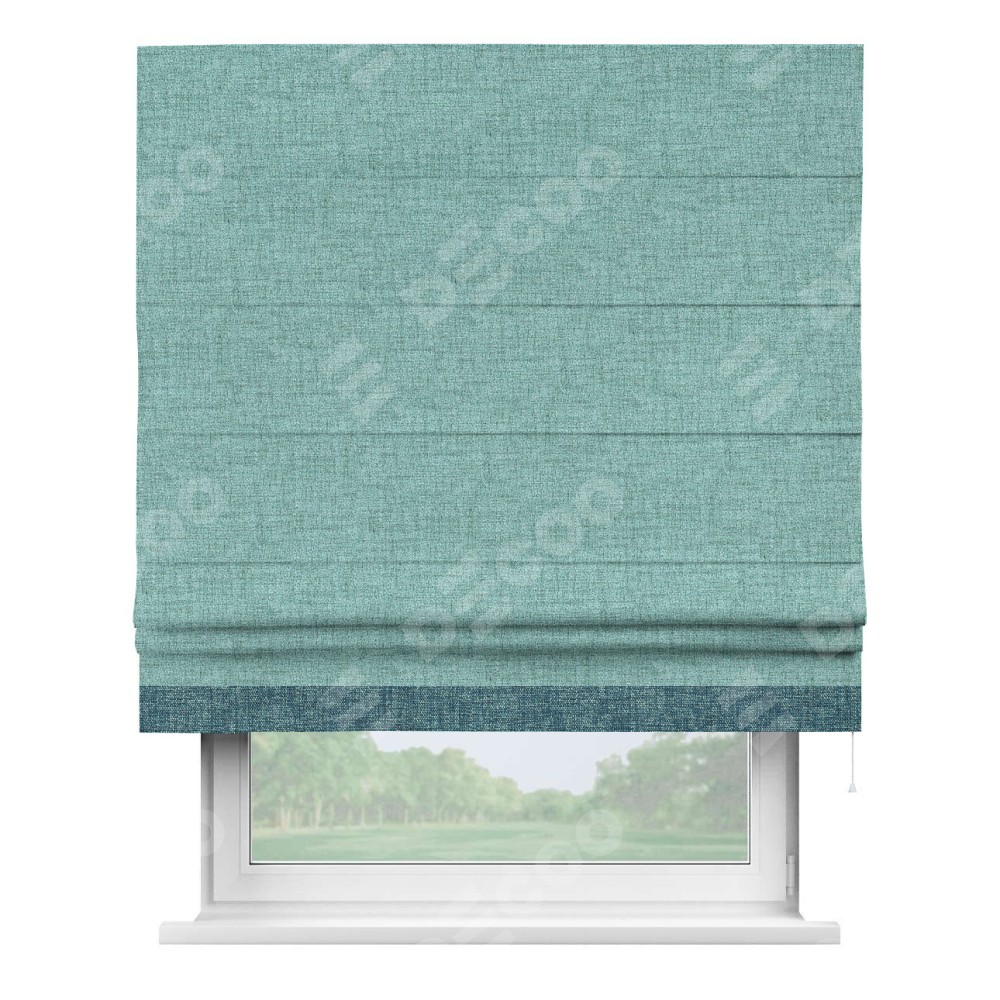 Римская штора пошита из ткани рогожка димаут аквамариновый крайола, артикул: 91023, с отделкой кантом «Джестер» выделяется своей уникальной особенностью — кантом, расположенным только снизу шторы. Этот дизайн добавляет оригинальности и игривости оконному оформлению, делая акцент на нижней части шторы и создавая интересный визуальный эффект. Отделка кантом на нижнем крае не только служит эстетической функции, но и способствует увеличению прочности и износостойкости ткани в этом месте.