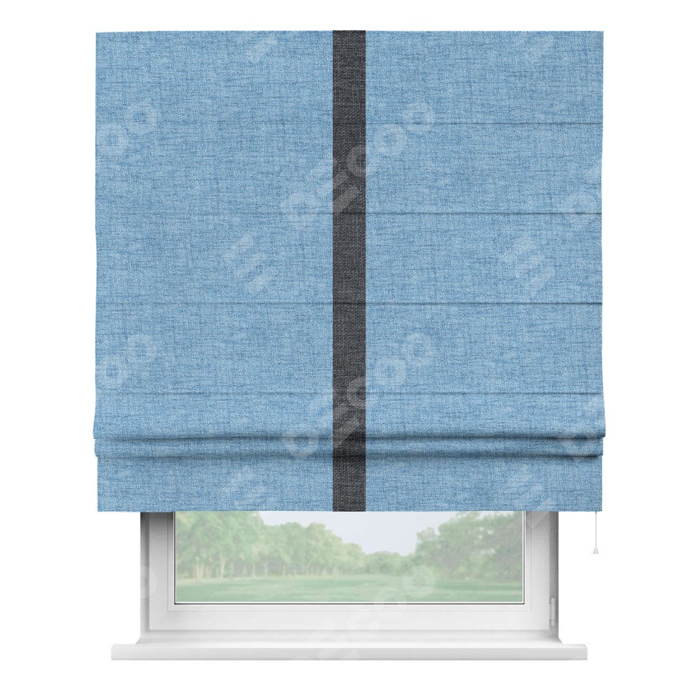 Римская штора пошита из ткани рогожка димаут голубой, артикул: 91025, с отделкой кантом «Хайвэй» представляет собой уникальное и смелое дизайнерское решение, где кант расположен вертикально посередине шторы. Этот дизайн не только выделяет штору среди других вариантов оформления окон, но и создает интересный визуальный акцент, привлекая внимание к центру окна и разделяя штору на визуальные зоны. Такой нестандартный подход добавляет динамичности интерьеру и может быть использован для подчеркивания особенностей оформления помещения.