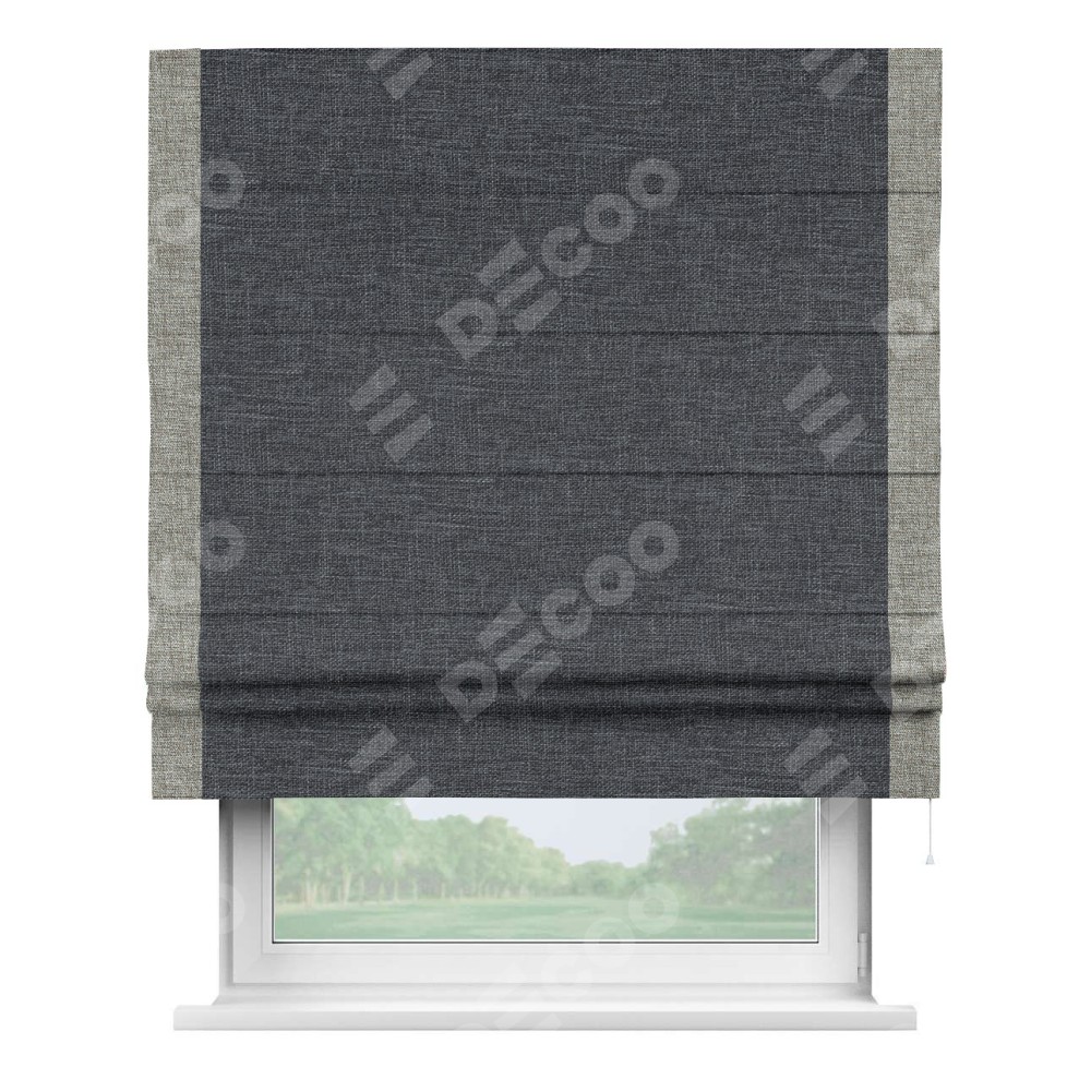 Римская штора пошита из ткани рогожка димаут графит, артикул: 90950, с отделкой кантом «Стрим Дуо» выделяется наличием кантов по обоим бокам шторы, слева и справа. Этот дизайн придает шторе аккуратный и завершенный вид, акцентируя вертикальные линии и визуально вытягивая окно в высоту. Отделка кантом по бокам не только украшает штору, но и служит практической функцией, укрепляя края и продлевая срок службы изделия.