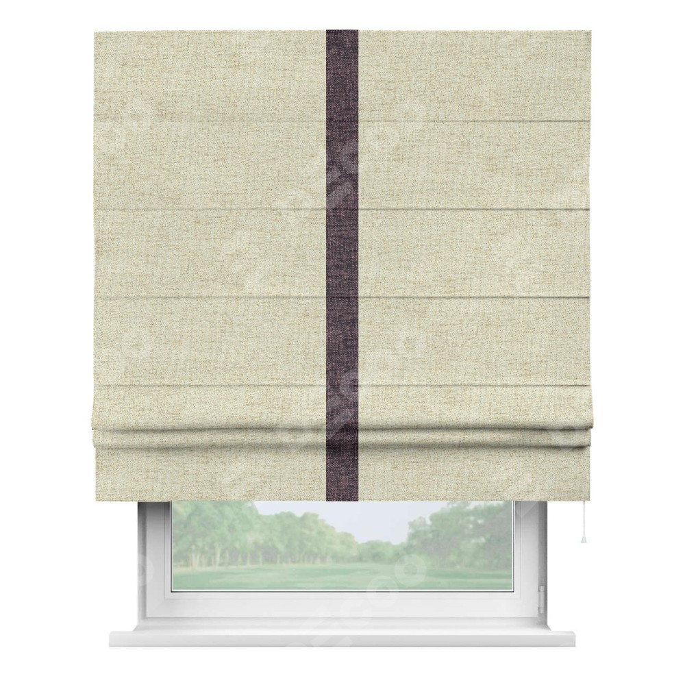 Римская штора пошита из ткани рогожка димаут золотой песок, артикул: 91015, с отделкой кантом «Хайвэй» представляет собой уникальное и смелое дизайнерское решение, где кант расположен вертикально посередине шторы. Этот дизайн не только выделяет штору среди других вариантов оформления окон, но и создает интересный визуальный акцент, привлекая внимание к центру окна и разделяя штору на визуальные зоны. Такой нестандартный подход добавляет динамичности интерьеру и может быть использован для подчеркивания особенностей оформления помещения.