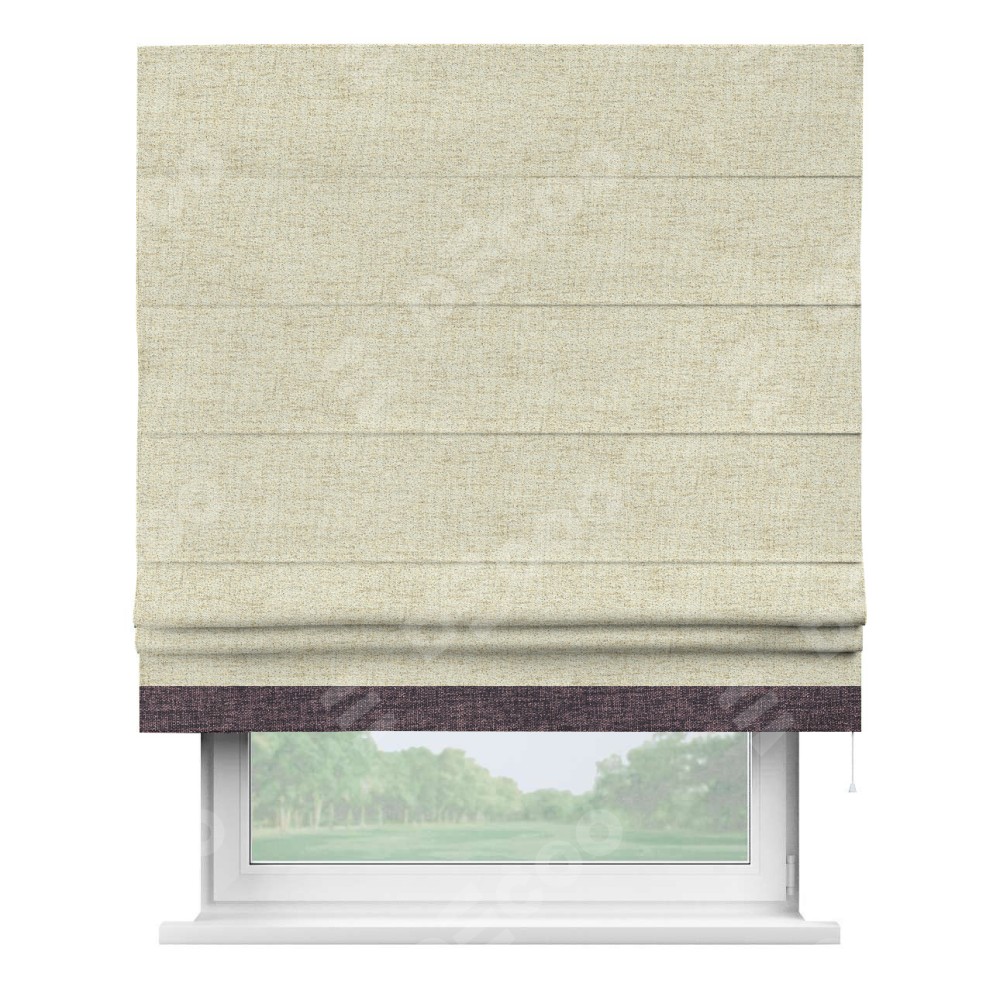 Римская штора пошита из ткани рогожка димаут золотой песок, артикул: 91015, с отделкой кантом «Джестер» выделяется своей уникальной особенностью — кантом, расположенным только снизу шторы. Этот дизайн добавляет оригинальности и игривости оконному оформлению, делая акцент на нижней части шторы и создавая интересный визуальный эффект. Отделка кантом на нижнем крае не только служит эстетической функции, но и способствует увеличению прочности и износостойкости ткани в этом месте.