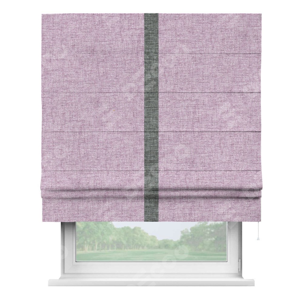 Римская штора пошита из ткани рогожка димаут розовый, артикул: 91031, с отделкой кантом «Хайвэй» представляет собой уникальное и смелое дизайнерское решение, где кант расположен вертикально посередине шторы. Этот дизайн не только выделяет штору среди других вариантов оформления окон, но и создает интересный визуальный акцент, привлекая внимание к центру окна и разделяя штору на визуальные зоны. Такой нестандартный подход добавляет динамичности интерьеру и может быть использован для подчеркивания особенностей оформления помещения.