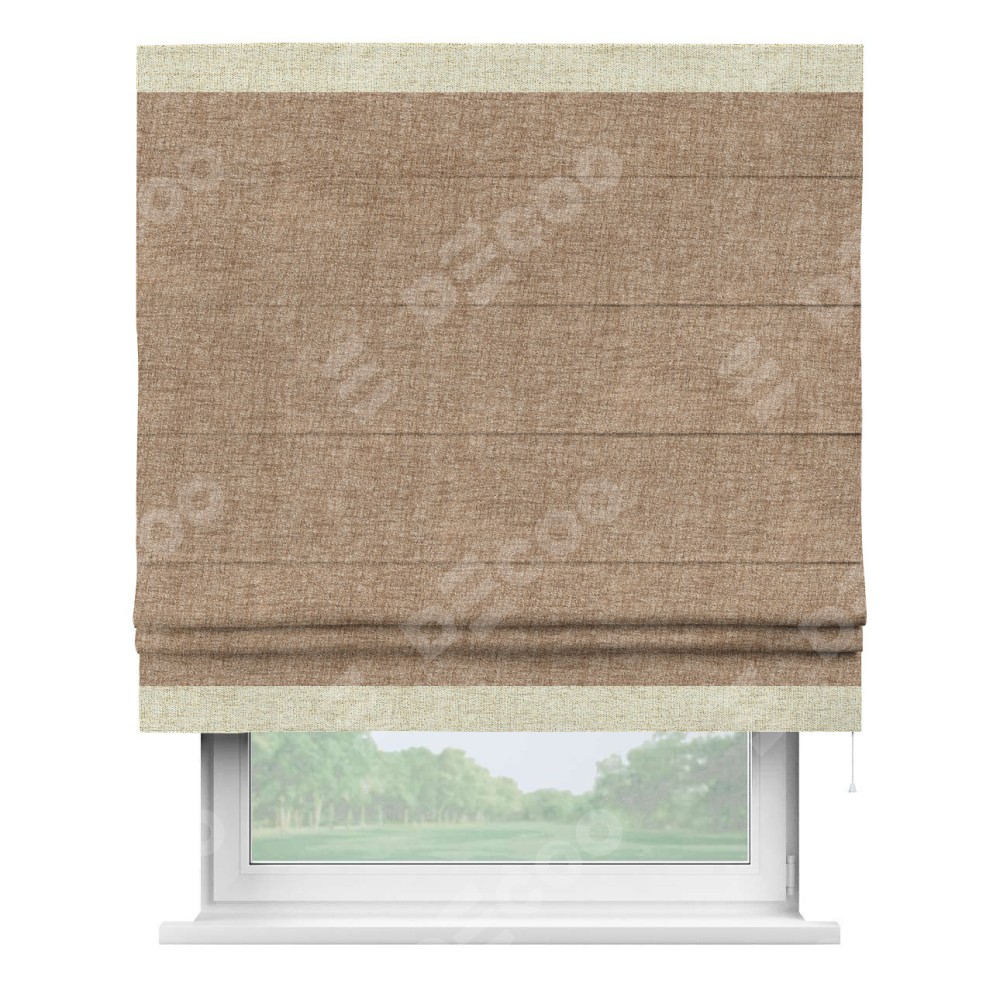 Римская штора пошита из ткани рогожка димаут светло-коричневый, артикул: 91017, с отделкой кантом «Горизонт» предлагает уникальное дизайнерское решение, при котором кант располагается только вверху и снизу шторы. Такое решение делает акцент на горизонтальных линиях, визуально расширяя пространство и придавая окну более строгий и организованный вид. Отделка кантом в этих ключевых местах не только украшает штору, но и способствует её долговечности, защищая наиболее уязвимые к износу края.