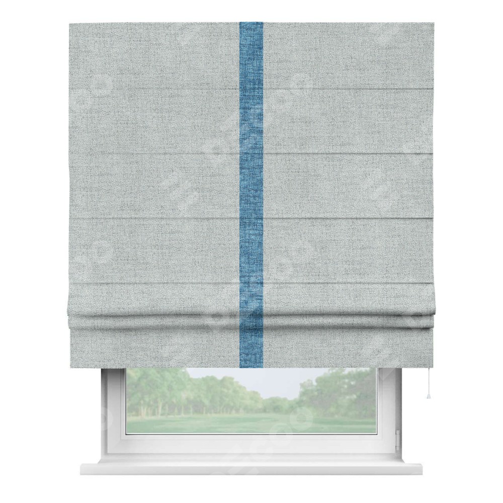 Римская штора пошита из ткани рогожка димаут серый, артикул: 91027, с отделкой кантом «Хайвэй» представляет собой уникальное и смелое дизайнерское решение, где кант расположен вертикально посередине шторы. Этот дизайн не только выделяет штору среди других вариантов оформления окон, но и создает интересный визуальный акцент, привлекая внимание к центру окна и разделяя штору на визуальные зоны. Такой нестандартный подход добавляет динамичности интерьеру и может быть использован для подчеркивания особенностей оформления помещения.