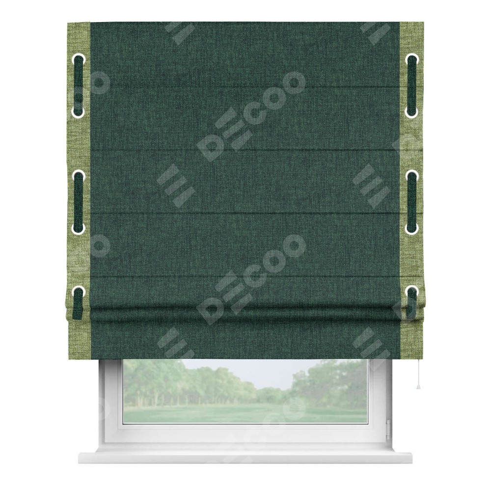 Римская штора «Кортин» для проёма, рогожка димаут тёмно-зелёный, с кантом Стрим Дуо (люверсы с пояском)
