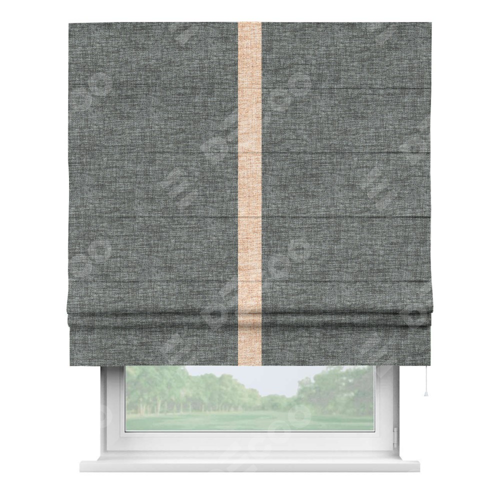 Римская штора пошита из ткани рогожка димаут тёмно-серый, артикул: 91029, с отделкой кантом «Хайвэй» представляет собой уникальное и смелое дизайнерское решение, где кант расположен вертикально посередине шторы. Этот дизайн не только выделяет штору среди других вариантов оформления окон, но и создает интересный визуальный акцент, привлекая внимание к центру окна и разделяя штору на визуальные зоны. Такой нестандартный подход добавляет динамичности интерьеру и может быть использован для подчеркивания особенностей оформления помещения.