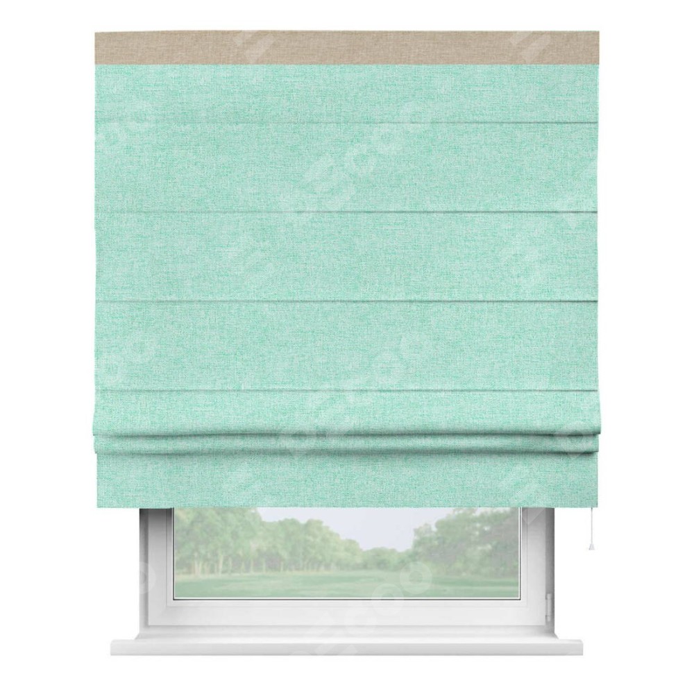 Римская штора пошита из ткани лён кашемир мятный, артикул: 21617, с отделкой кантом «Кинг» отличается своей необычной особенностью: кант располагается исключительно сверху шторы. Такой дизайн делает акцент на верхней части окна, визуально поднимая потолок и придавая интерьеру более возвышенный и изысканный вид. Отделка кантом на верхней кромке не только украшает штору, но и может служить дополнительной защитой от износа в месте наибольшего контакта с механизмом управления шторой.