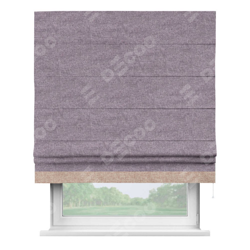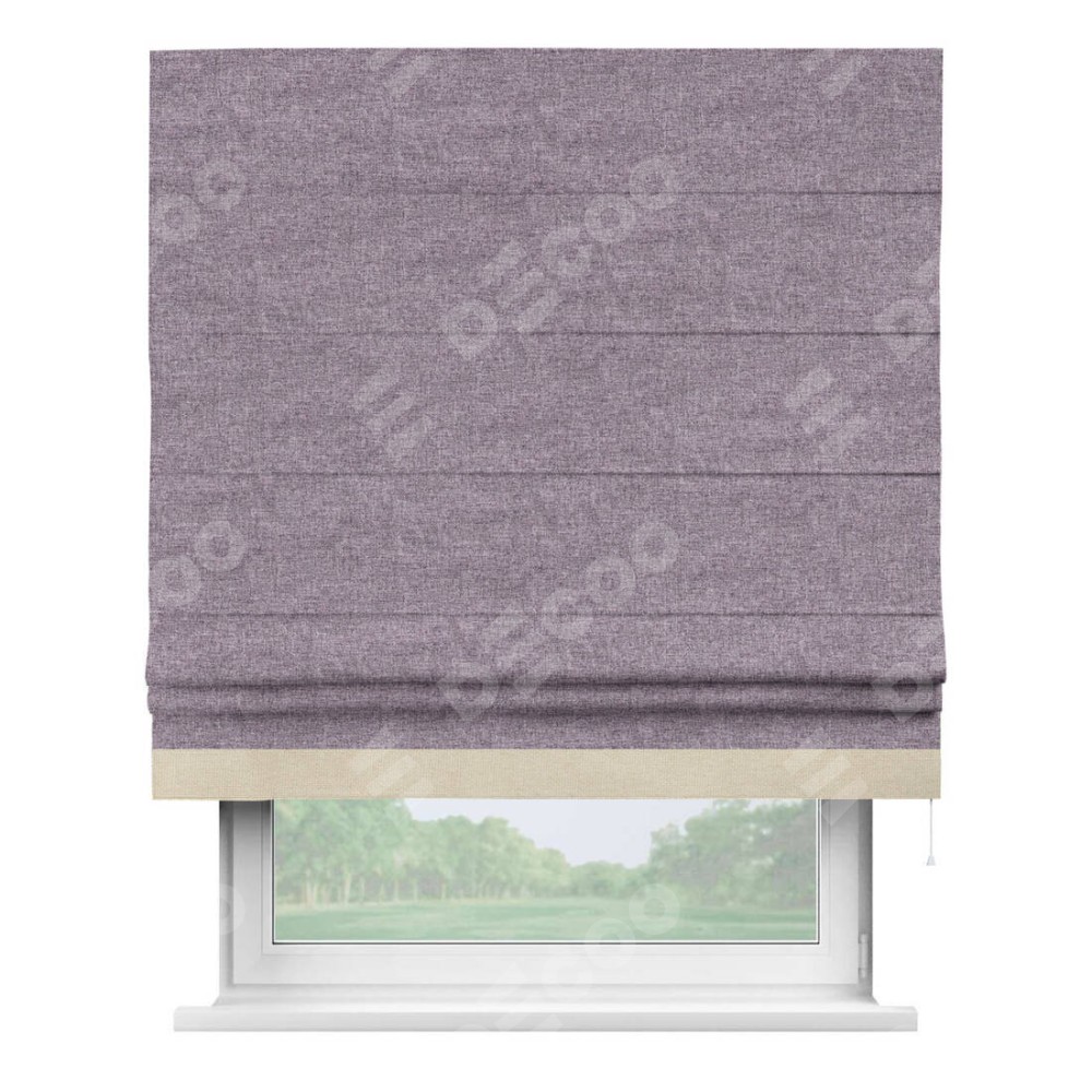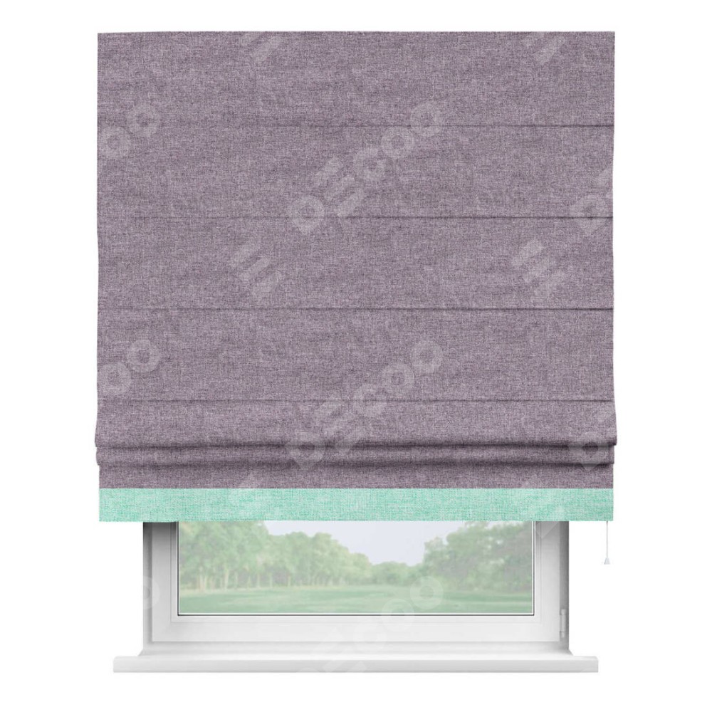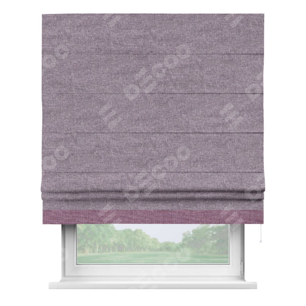 Римская штора пошита из ткани лён кашемир фиолетовый, артикул: 17211, с отделкой кантом «Джестер» выделяется своей уникальной особенностью — кантом, расположенным только снизу шторы. Этот дизайн добавляет оригинальности и игривости оконному оформлению, делая акцент на нижней части шторы и создавая интересный визуальный эффект. Отделка кантом на нижнем крае не только служит эстетической функции, но и способствует увеличению прочности и износостойкости ткани в этом месте.