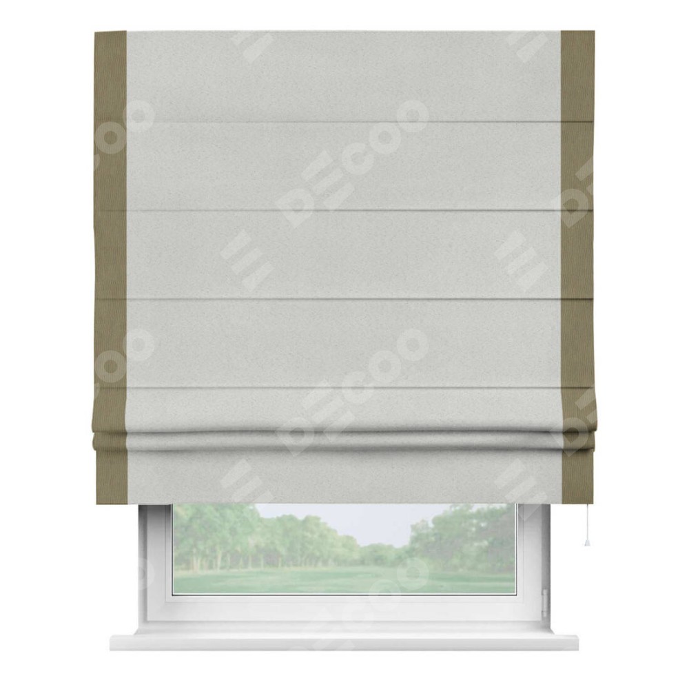 Римская штора пошита из ткани однотонный блэкаут милк, артикул: 23, с отделкой кантом «Стрим Дуо» выделяется наличием кантов по обоим бокам шторы, слева и справа. Этот дизайн придает шторе аккуратный и завершенный вид, акцентируя вертикальные линии и визуально вытягивая окно в высоту. Отделка кантом по бокам не только украшает штору, но и служит практической функцией, укрепляя края и продлевая срок службы изделия.