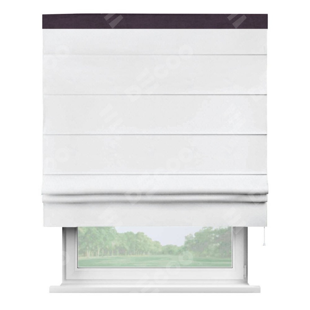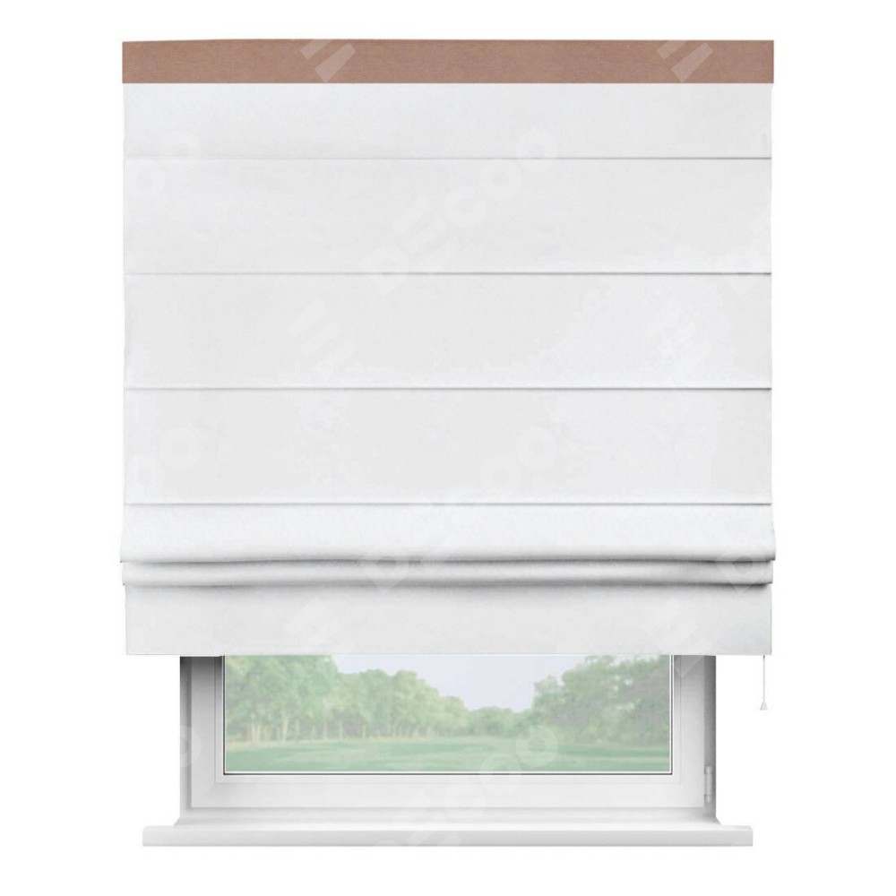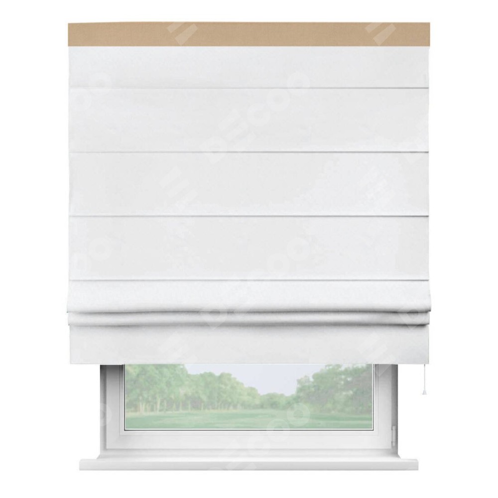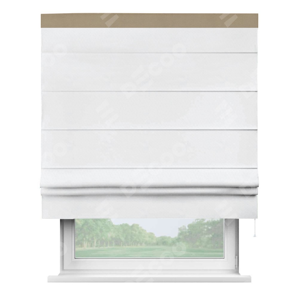 Римская штора пошита из ткани вельвет белоснежный, артикул: 92698, с отделкой кантом «Кинг» отличается своей необычной особенностью: кант располагается исключительно сверху шторы. Такой дизайн делает акцент на верхней части окна, визуально поднимая потолок и придавая интерьеру более возвышенный и изысканный вид. Отделка кантом на верхней кромке не только украшает штору, но и может служить дополнительной защитой от износа в месте наибольшего контакта с механизмом управления шторой.
