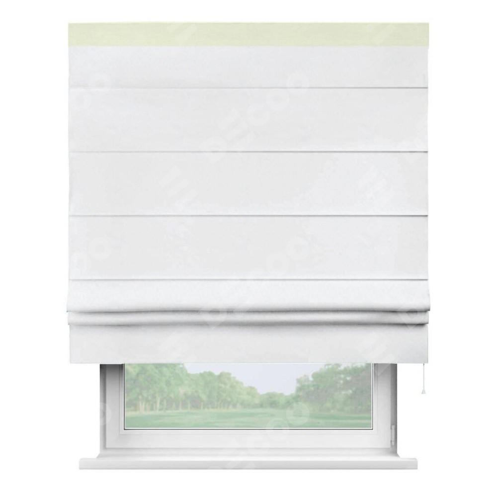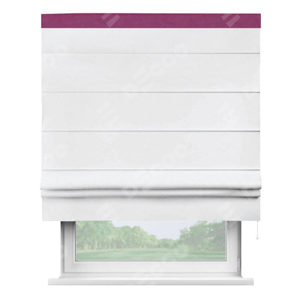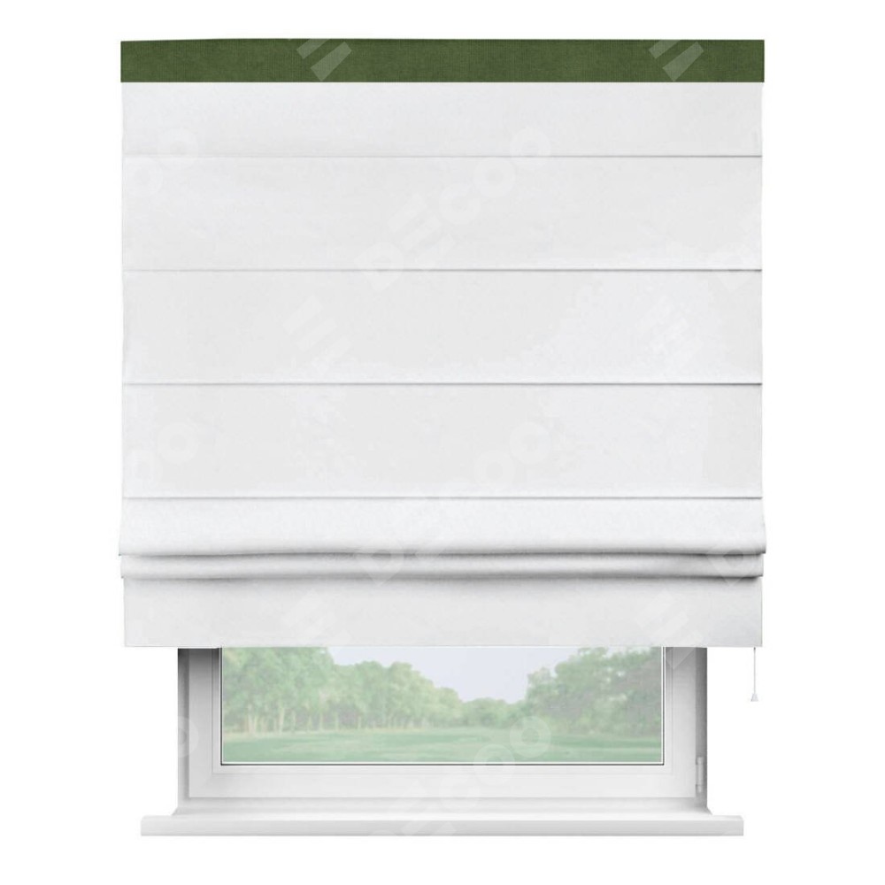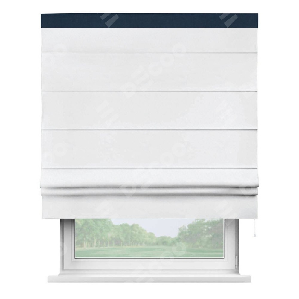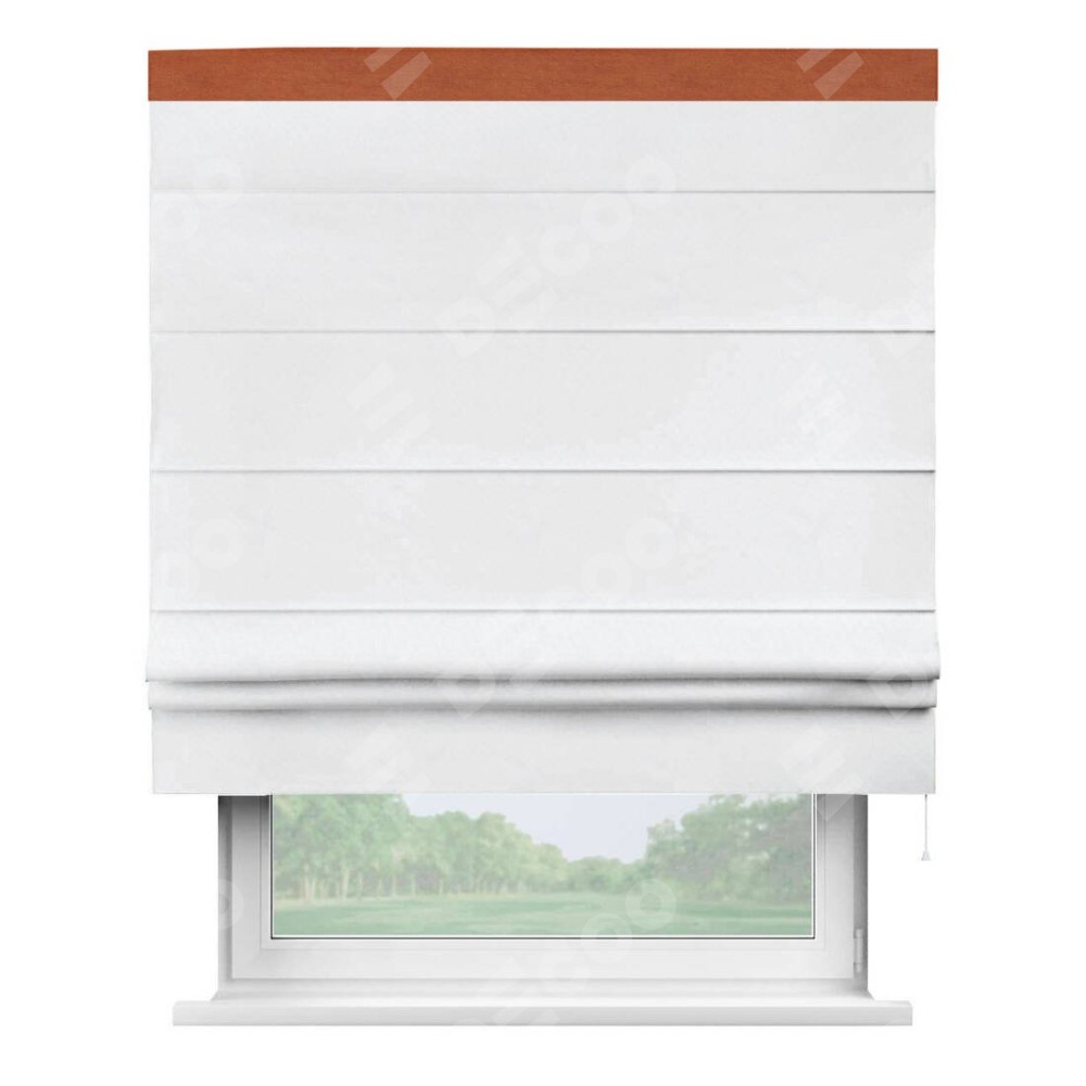 Римская штора пошита из ткани вельвет белоснежный, артикул: 92698, с отделкой кантом «Кинг» отличается своей необычной особенностью: кант располагается исключительно сверху шторы. Такой дизайн делает акцент на верхней части окна, визуально поднимая потолок и придавая интерьеру более возвышенный и изысканный вид. Отделка кантом на верхней кромке не только украшает штору, но и может служить дополнительной защитой от износа в месте наибольшего контакта с механизмом управления шторой.