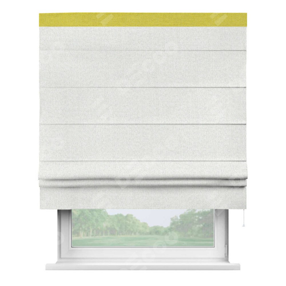 Римская штора пошита из ткани лён шампань, артикул: 91399, с отделкой кантом «Кинг» отличается своей необычной особенностью: кант располагается исключительно сверху шторы. Такой дизайн делает акцент на верхней части окна, визуально поднимая потолок и придавая интерьеру более возвышенный и изысканный вид. Отделка кантом на верхней кромке не только украшает штору, но и может служить дополнительной защитой от износа в месте наибольшего контакта с механизмом управления шторой.