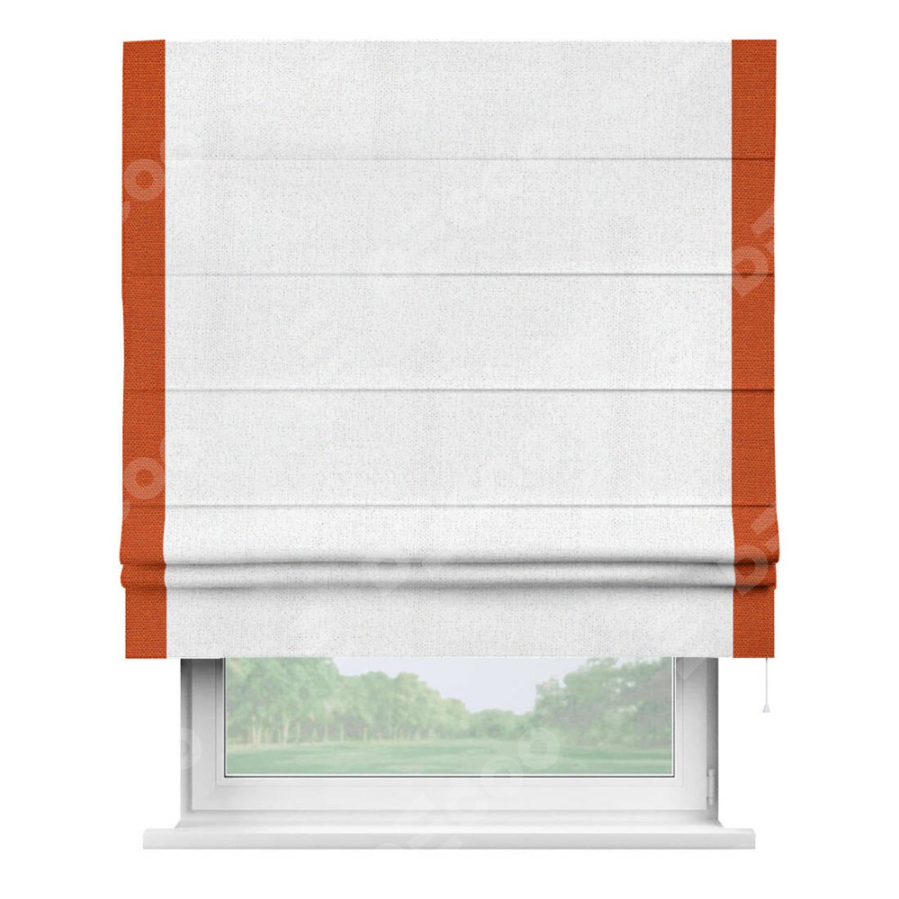 Римская штора пошита из ткани лён белоснежный, артикул: 95632, с отделкой кантом «Стрим Дуо» выделяется наличием кантов по обоим бокам шторы, слева и справа. Этот дизайн придает шторе аккуратный и завершенный вид, акцентируя вертикальные линии и визуально вытягивая окно в высоту. Отделка кантом по бокам не только украшает штору, но и служит практической функцией, укрепляя края и продлевая срок службы изделия.