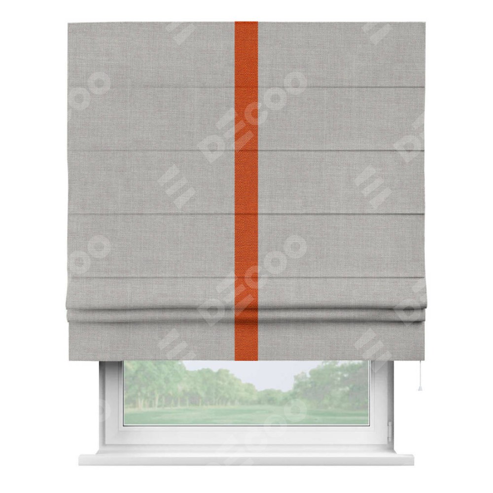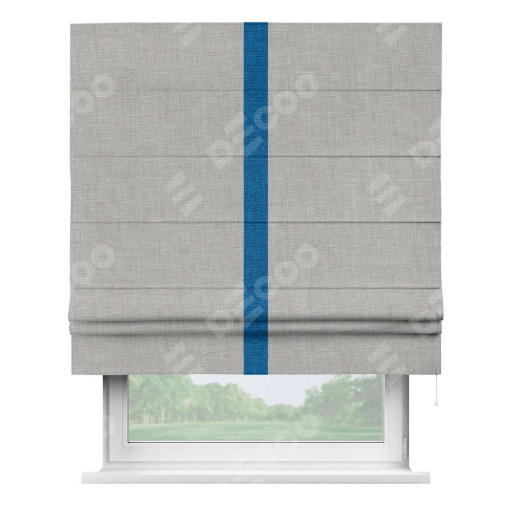 Римская штора пошита из ткани лён серый, артикул: 91410, с отделкой кантом «Хайвэй» представляет собой уникальное и смелое дизайнерское решение, где кант расположен вертикально посередине шторы. Этот дизайн не только выделяет штору среди других вариантов оформления окон, но и создает интересный визуальный акцент, привлекая внимание к центру окна и разделяя штору на визуальные зоны. Такой нестандартный подход добавляет динамичности интерьеру и может быть использован для подчеркивания особенностей оформления помещения.