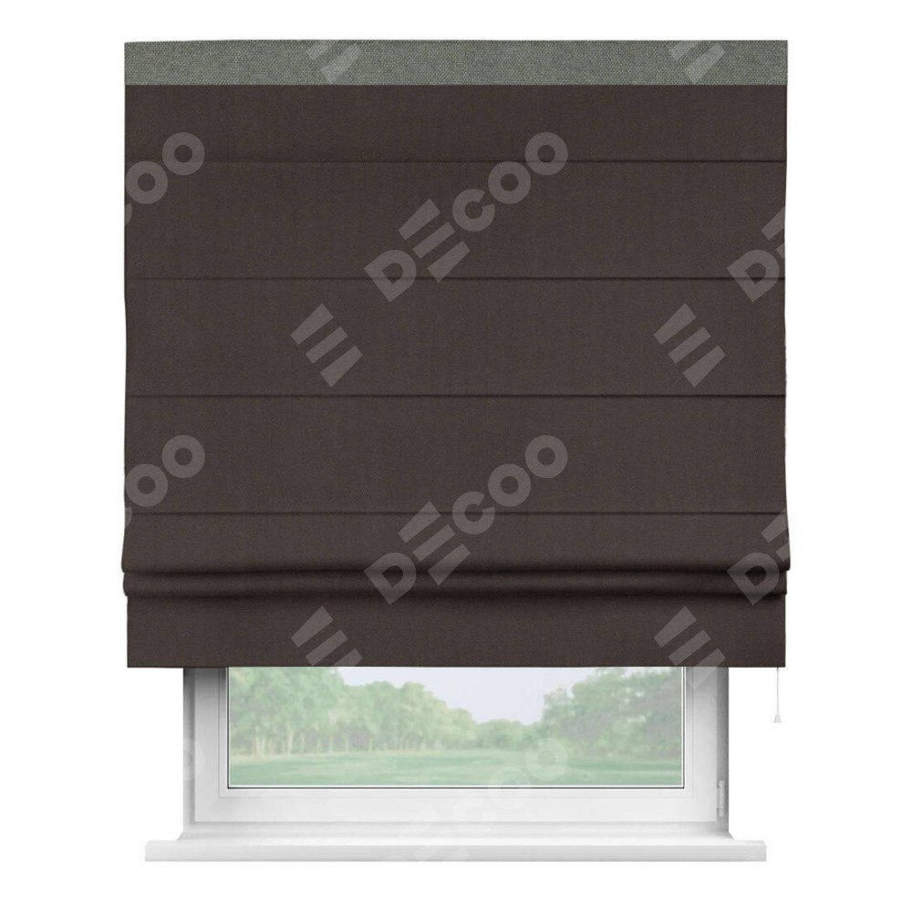 Римская штора пошита из ткани лён димаут венге, артикул: 91001, с отделкой кантом «Кинг» отличается своей необычной особенностью: кант располагается исключительно сверху шторы. Такой дизайн делает акцент на верхней части окна, визуально поднимая потолок и придавая интерьеру более возвышенный и изысканный вид. Отделка кантом на верхней кромке не только украшает штору, но и может служить дополнительной защитой от износа в месте наибольшего контакта с механизмом управления шторой.