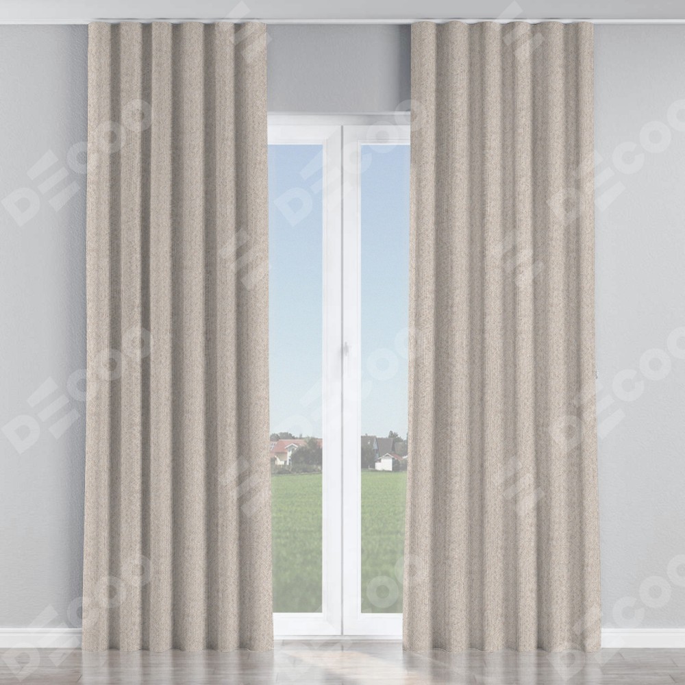 Комплект прямых штор, от производителя «Cortin», пошиты из ткани лён димаут бежевый, артикул ткани 01. С изнаночной стороны в верхней части штор пристрачивается шторная лента с декоративными складками «Волна». Для создания элегантных складок рекомендуемый коэффициент 1:2 (на 100 см. ширины проёма 200 см. ширины ткани). Важно! Ширина штор указана без учёта коэффициента сборки!