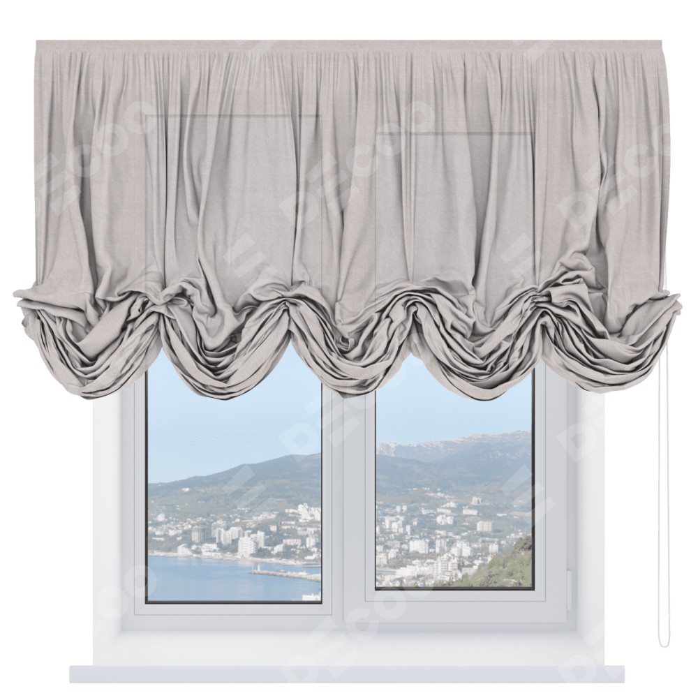 Австрийская штора производителя «Cortin», используется для проёма, пошита из ткани лён кашемир натуральный беж. Имеет универсальный механизм и подходит для монтажа: на потолок и на стену.