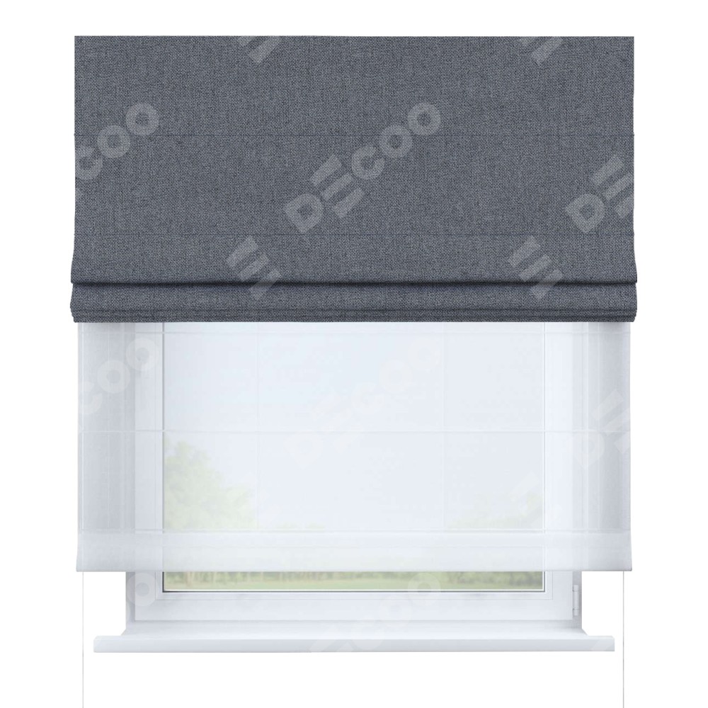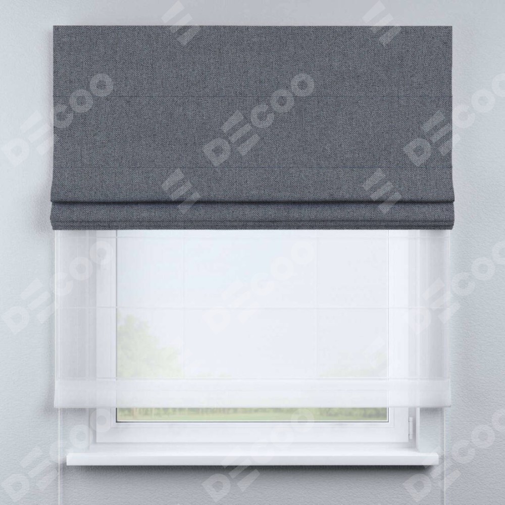 Двойная римская штора «День-ночь» от производителя Cortin предназначена для использования в проёмах. Эта штора уникальна тем, что состоит из двух полотен. На лицевой стороне находится лён блэкаут тёмно-серый (артикул: 139663), обеспечивающий эффективное затемнение. В комплект также входит вторая ткань — легкий белый тюль (артикул: V-01), который добавляет изящества и легкости оформлению окна. Кроме того, доступны и другие разновидности ткани тюль, выбор которых доступен по  ссылке .