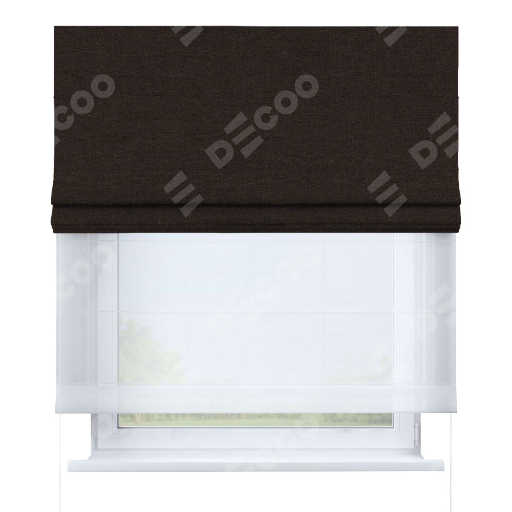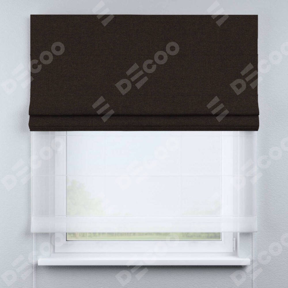 Двойная римская штора «День-ночь» от производителя Cortin предназначена для использования в проёмах. Эта штора уникальна тем, что состоит из двух полотен. На лицевой стороне находится лён тёмно-коричневый (артикул: 104497), обеспечивающий эффективное затемнение. В комплект также входит вторая ткань — легкий белый тюль (артикул: V-01), который добавляет изящества и легкости оформлению окна. Кроме того, доступны и другие разновидности ткани тюль, выбор которых доступен по ссылке .