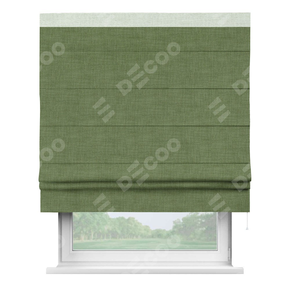 Классическая римская штора производителя «Cortin», пошита из ткани лён зелёный, артикул: 131547. Имеет универсальный механизм и подходит для монтажа: на потолок, на стену и в нишу.