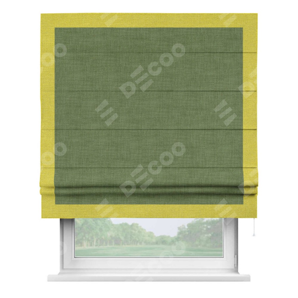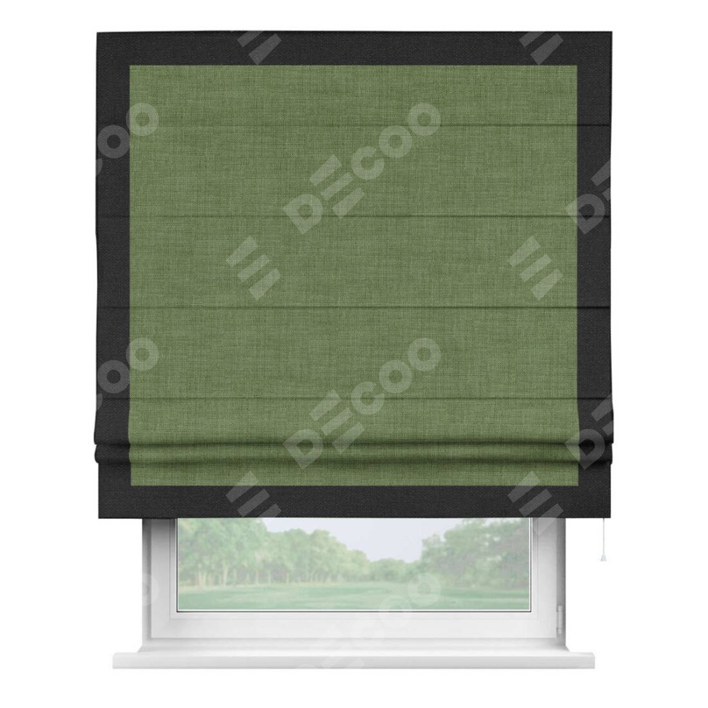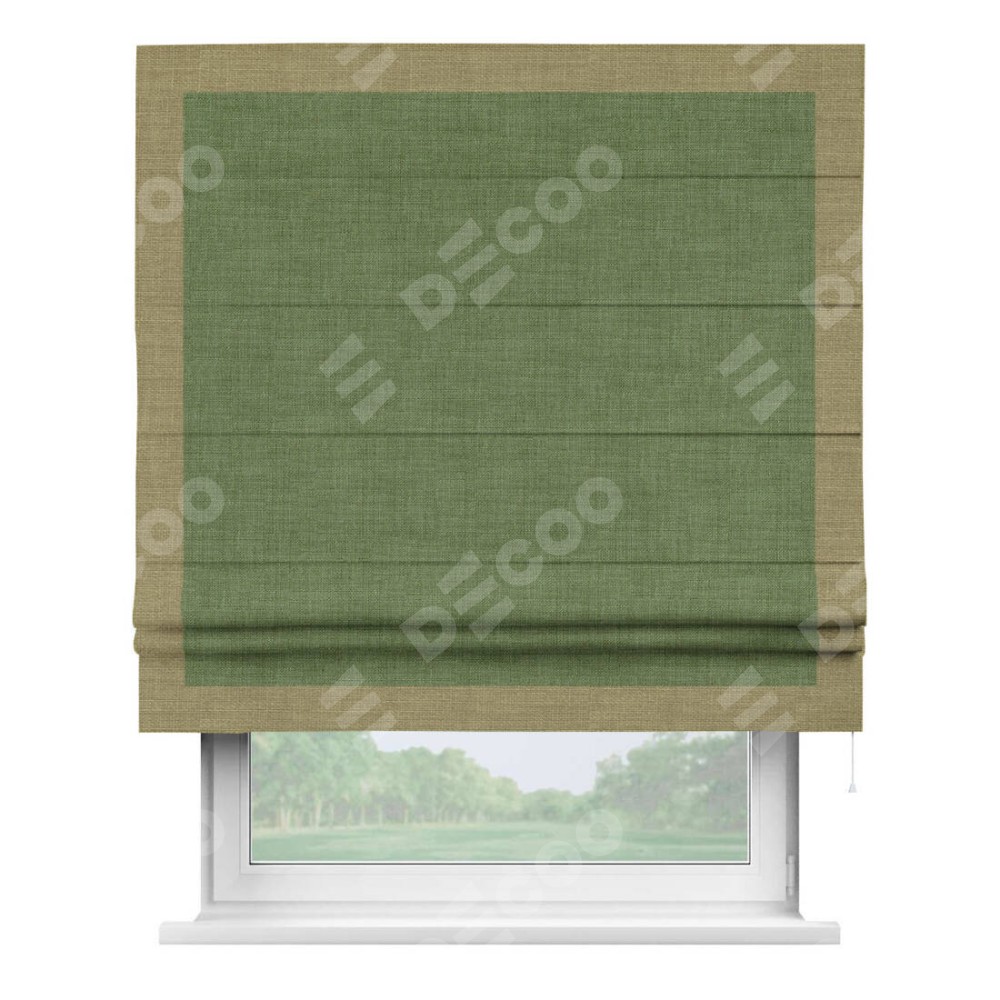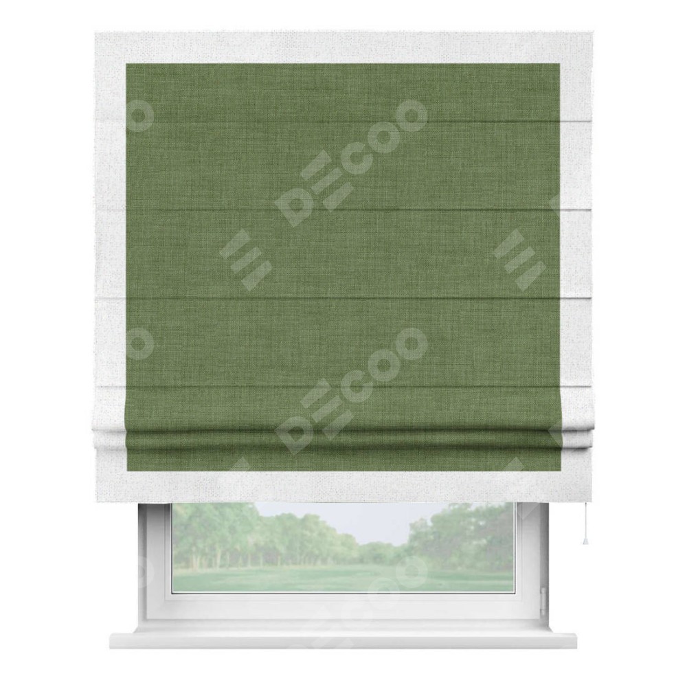 Классическая римская штора производителя «Cortin», пошита из ткани лён зелёный, артикул: 131547. Имеет универсальный механизм и подходит для монтажа: на потолок, на стену и в нишу.