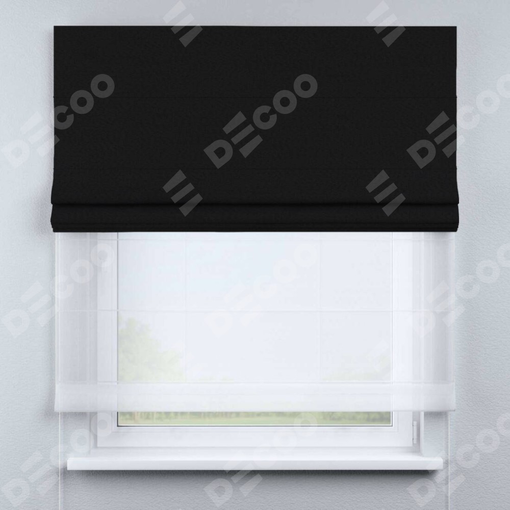 Двойная римская штора «День-ночь» от производителя Cortin предназначена для использования в проёмах. Эта штора уникальна тем, что состоит из двух полотен. На лицевой стороне находится лён рустик черный (артикул: 145313), обеспечивающий эффективное затемнение. В комплект также входит вторая ткань — легкий белый тюль (артикул: V-01), который добавляет изящества и легкости оформлению окна. Кроме того, доступны и другие разновидности ткани тюль, выбор которых доступен по  ссылке .