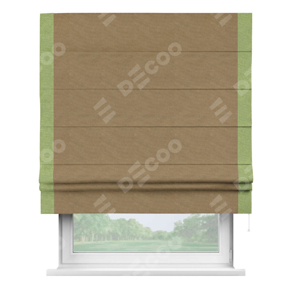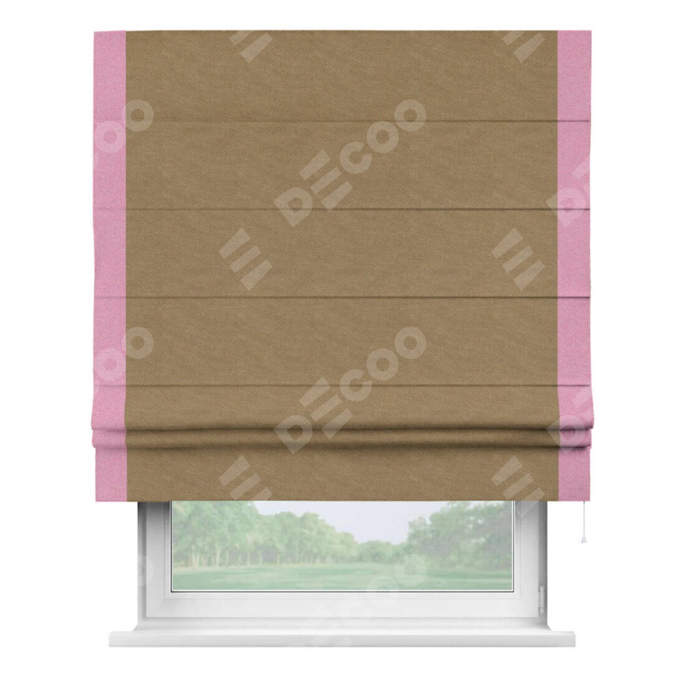 Римская штора производителя «Cortin», используется для проёма, пошита из ткани лён димаут коричневый, артикул 83026. Отделка шторы кантом «Стрим Дуо», ткань для канта используется из льна димаут разной расцветки на выбор. Имеет универсальный механизм и подходит для монтажа: на потолок, на стену и в нишу.