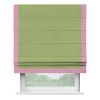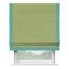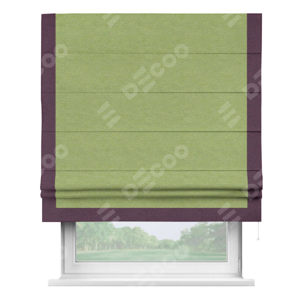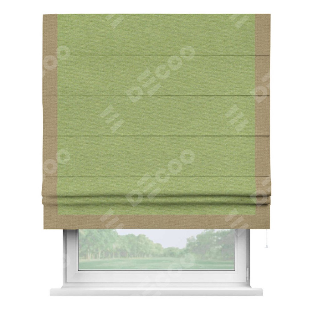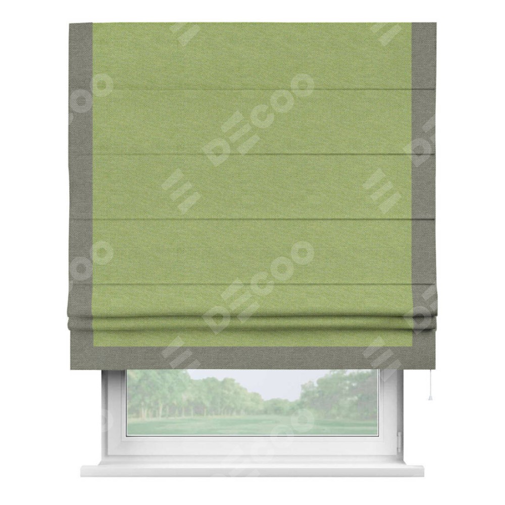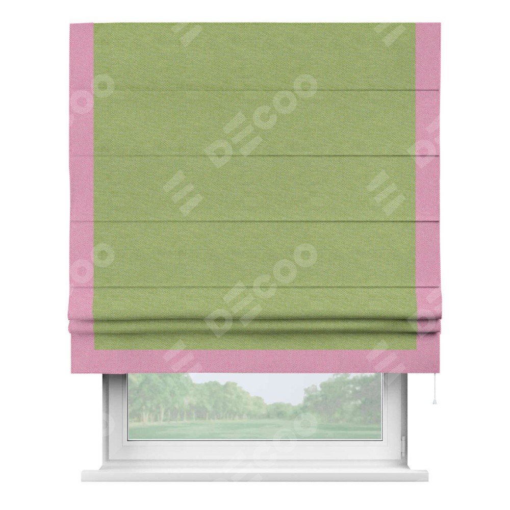 Римская штора производителя «Cortin», используется для проёма, пошита из ткани лён димаут салатовый, артикул 83032. Отделка шторы кантом «Виктория», ткань для канта используется из льна димаут разной расцветки на выбор. Имеет универсальный механизм и подходит для монтажа: на потолок, на стену и в нишу.