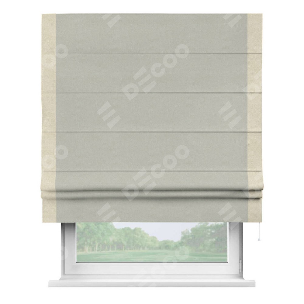 Римская штора производителя «Cortin», используется для проёма, пошита из ткани лён димаут светло-серый, артикул 83025. Отделка шторы кантом «Стрим Дуо», ткань для канта используется из льна димаут разной расцветки на выбор. Имеет универсальный механизм и подходит для монтажа: на потолок, на стену и в нишу.