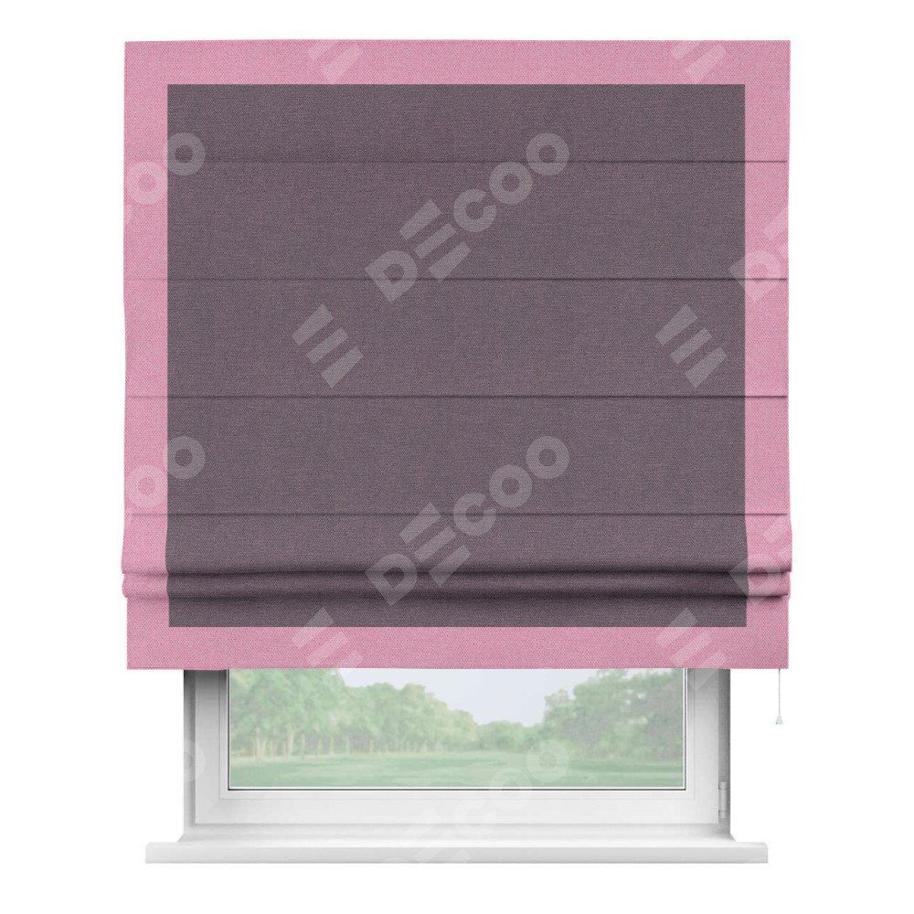 Римская штора производителя «Cortin», используется для проёма, пошита из ткани лён димаут светло-фиолетовый, артикул 83034. Отделка шторы кантом «Чесс», ткань для канта используется из льна димаут разной расцветки на выбор. Имеет универсальный механизм и подходит для монтажа: на потолок, на стену и в нишу.