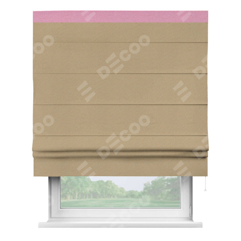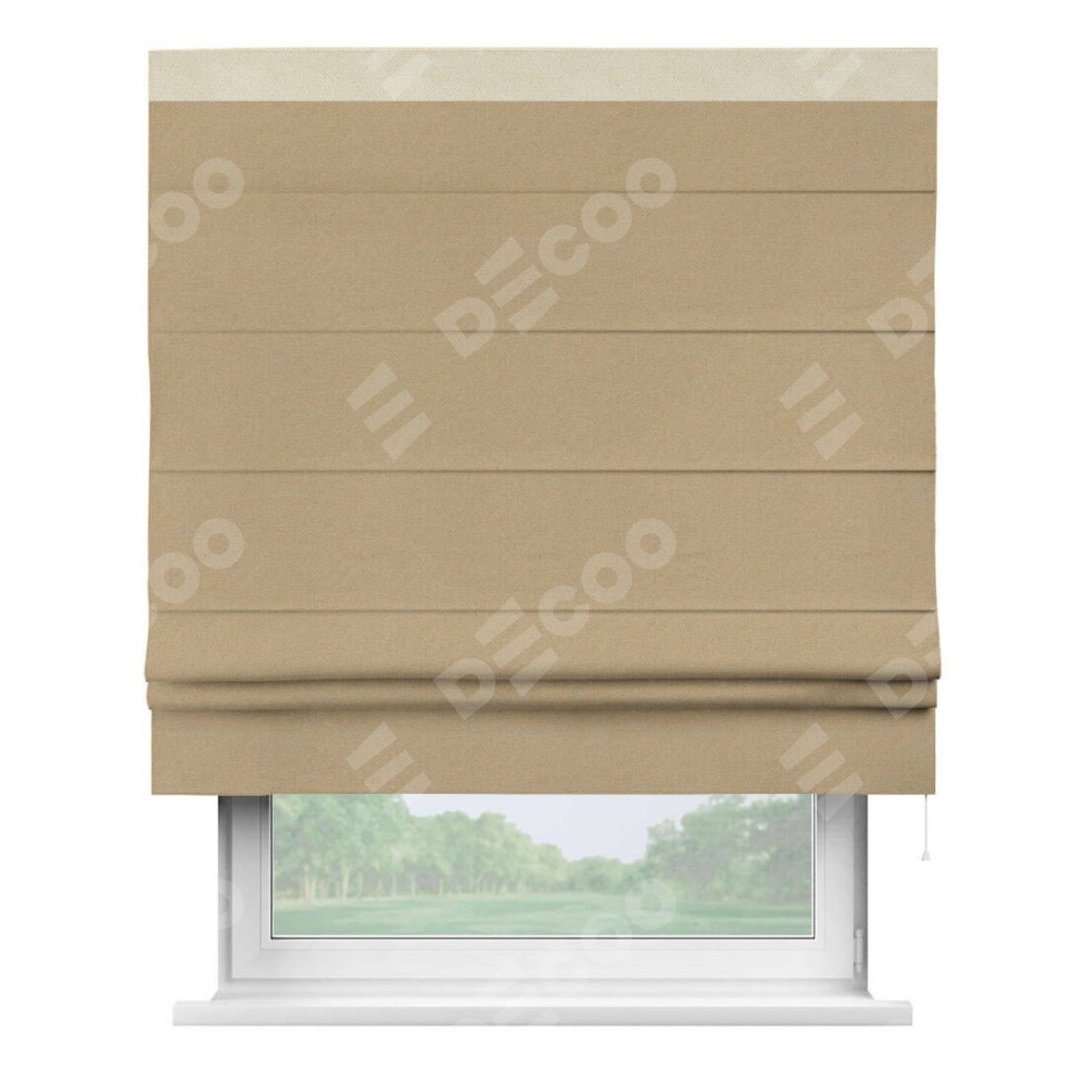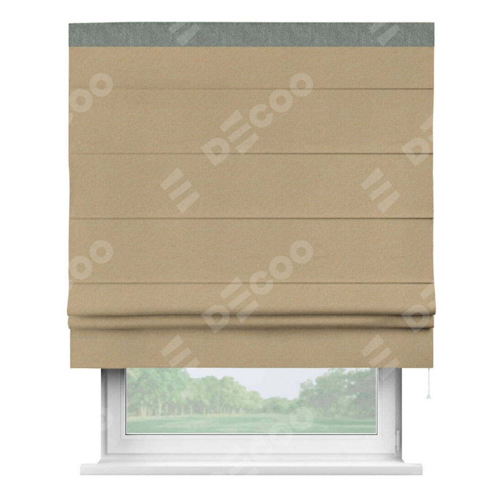 Римская штора производителя «Cortin», используется для проёма, пошита из ткани лён димаут тёмно-бежевый, артикул 83037. Отделка шторы кантом «Кинг», ткань для канта используется из льна димаут разной расцветки на выбор. Имеет универсальный механизм и подходит для монтажа: на потолок, на стену и в нишу.